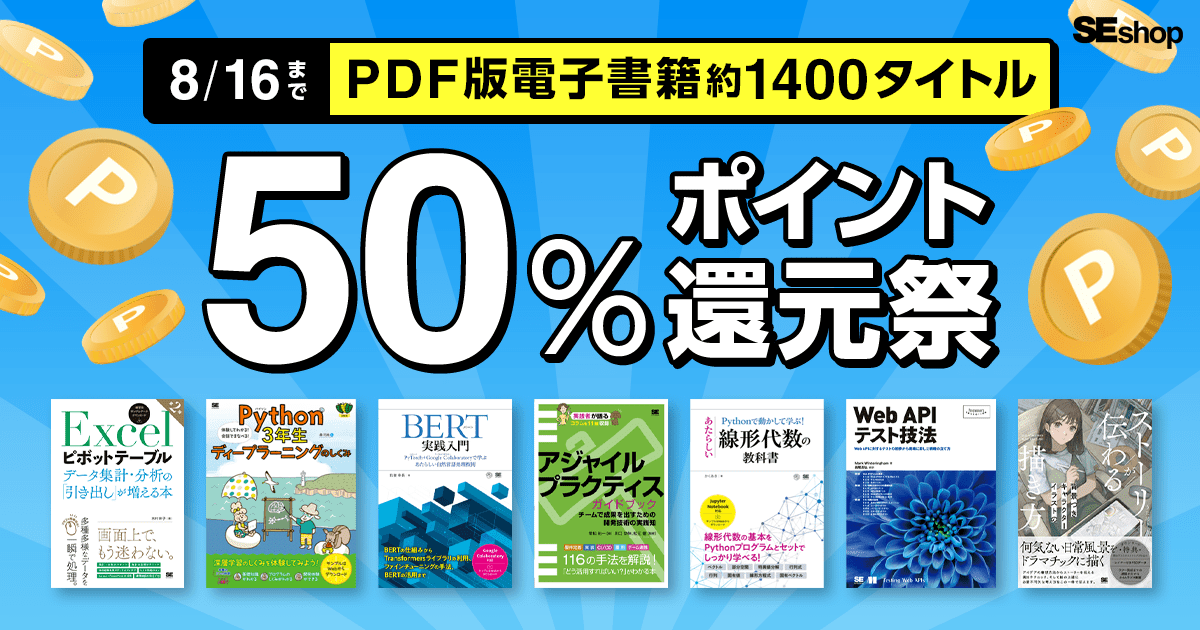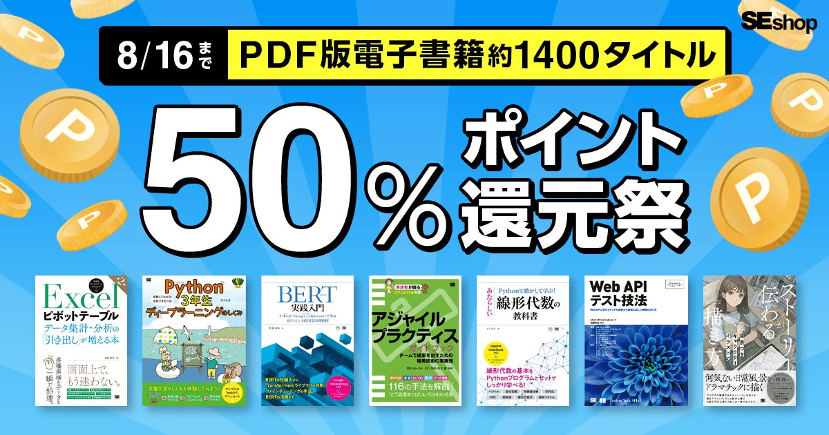 SEshopは、IT書・ビジネス書をはじめ、資格書や実⽤書まで幅広いラインナップを展開する翔泳社の公式通販サイトです。8月16日 まで、デバイスの種類を問わず利用できるPDF形式の電子書籍を購入すると、本体価格の50%をポイント還元する夏のキャンペーンを開催します。貯まったポイントは1ポイント=1円として次回のお買い物から使えます。新刊含む約1400タイトルが対象です。