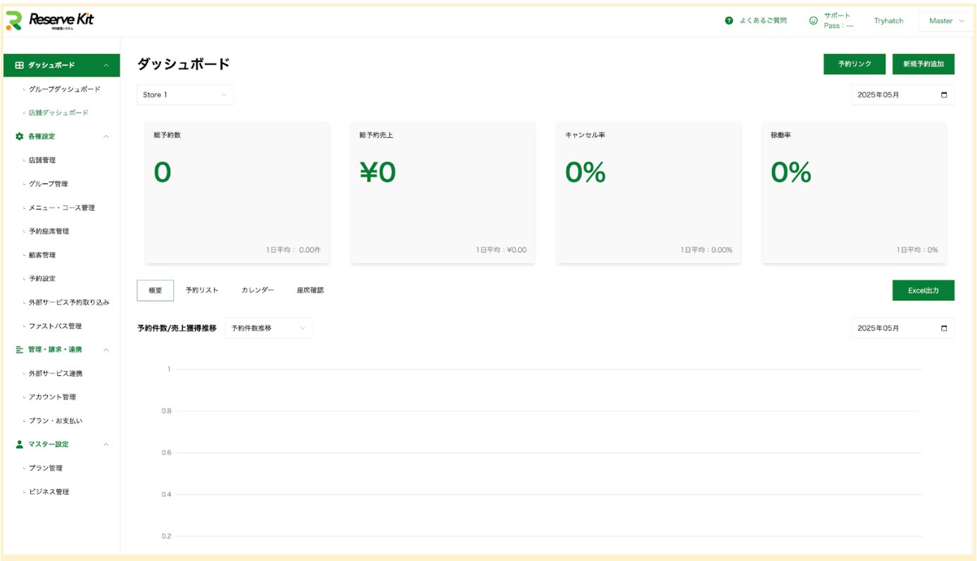 『Reserve Kit』は、店舗事業者向けの予約受付・CRM・分析・決済サービスをワンパッケージ化した予約DXプラットフォームです。複数チャネルに分散した来店予約を自動で取り込み、ダッシュボードで主要KPI(予約件数/売上/稼働率)をリアルタイムで表示します。