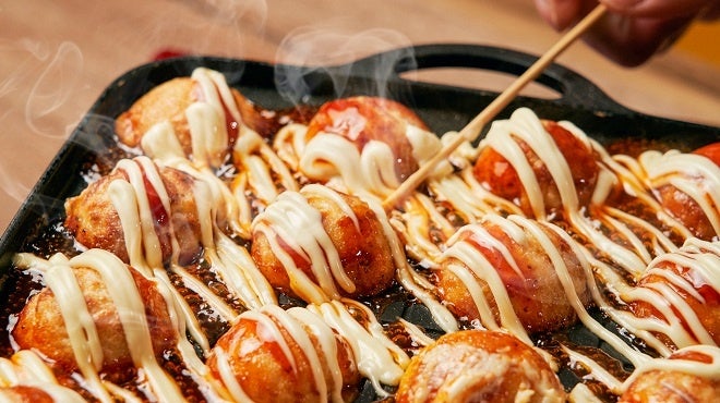 外はカリッ!中はとろとろ!プリッと大きなタコが顔を出す絶品たこ焼き!たっぷりのソースとマヨネーズをかけて召し上がれ。