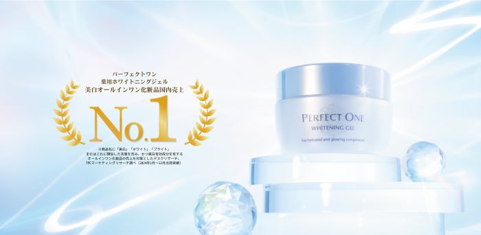 2021年6月の発売以来、ご好評いただいている「パーフェクトワン 薬用ホワイトニングジェル」は、1品で6役(化粧水、乳液、美容液、クリーム、パック、化粧下地)の機能を持つ美白※2オールインワンジェルです。この度、美白オールインワン化粧品市場において国内売上No.1※1を獲得いたしました。