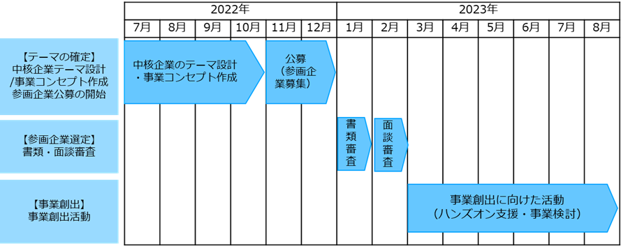 現在、中核企業3社とテーマ設計/事業コンセプトの作成を進めており、今後は各社が定めたテーマに関する参画企業の公募、事業創出に向けた活動を行ってまいります。