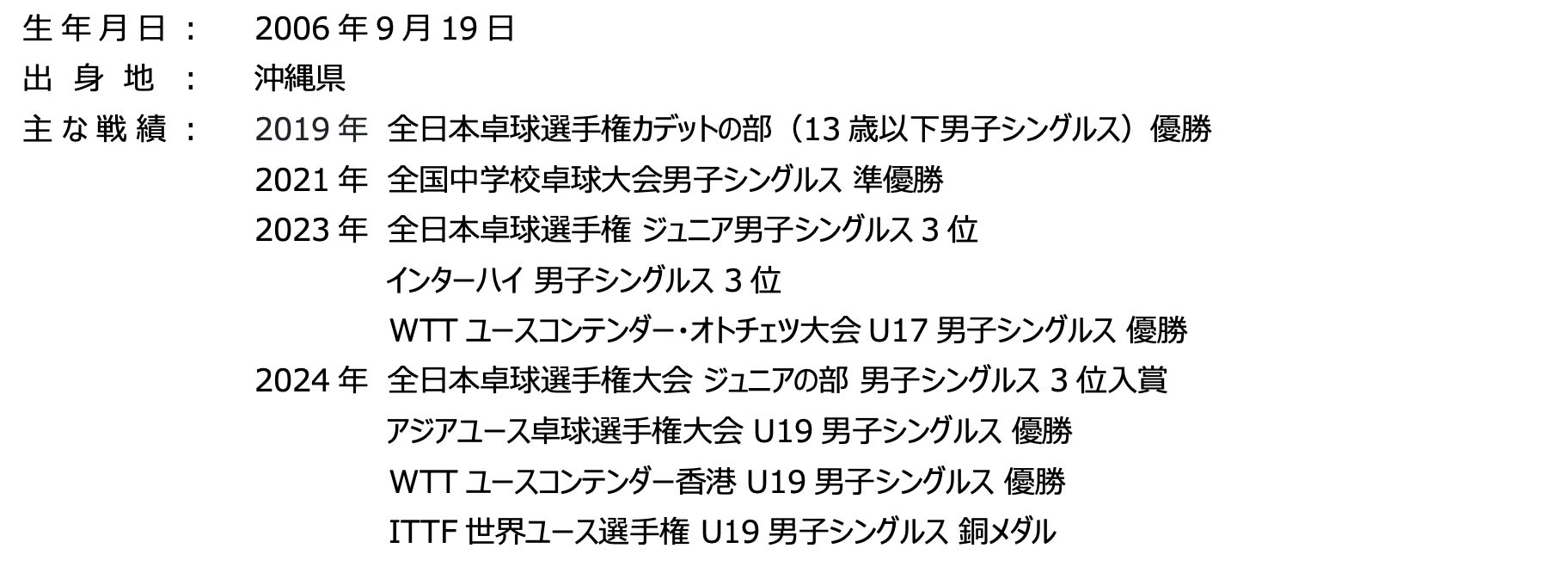 今シーズンから琉球アスティーダでプレーさせていただくことになりました。生まれ育った沖縄を代表するこの素晴らしいチームに加わることができ、言葉では表せないほどの喜びと誇りを感じています。持てる力と情熱のすべてを注ぎ、チームの勝利と沖縄の卓球文化の発展に貢献できるよう全力を尽くします。応援よろしくお願いします。