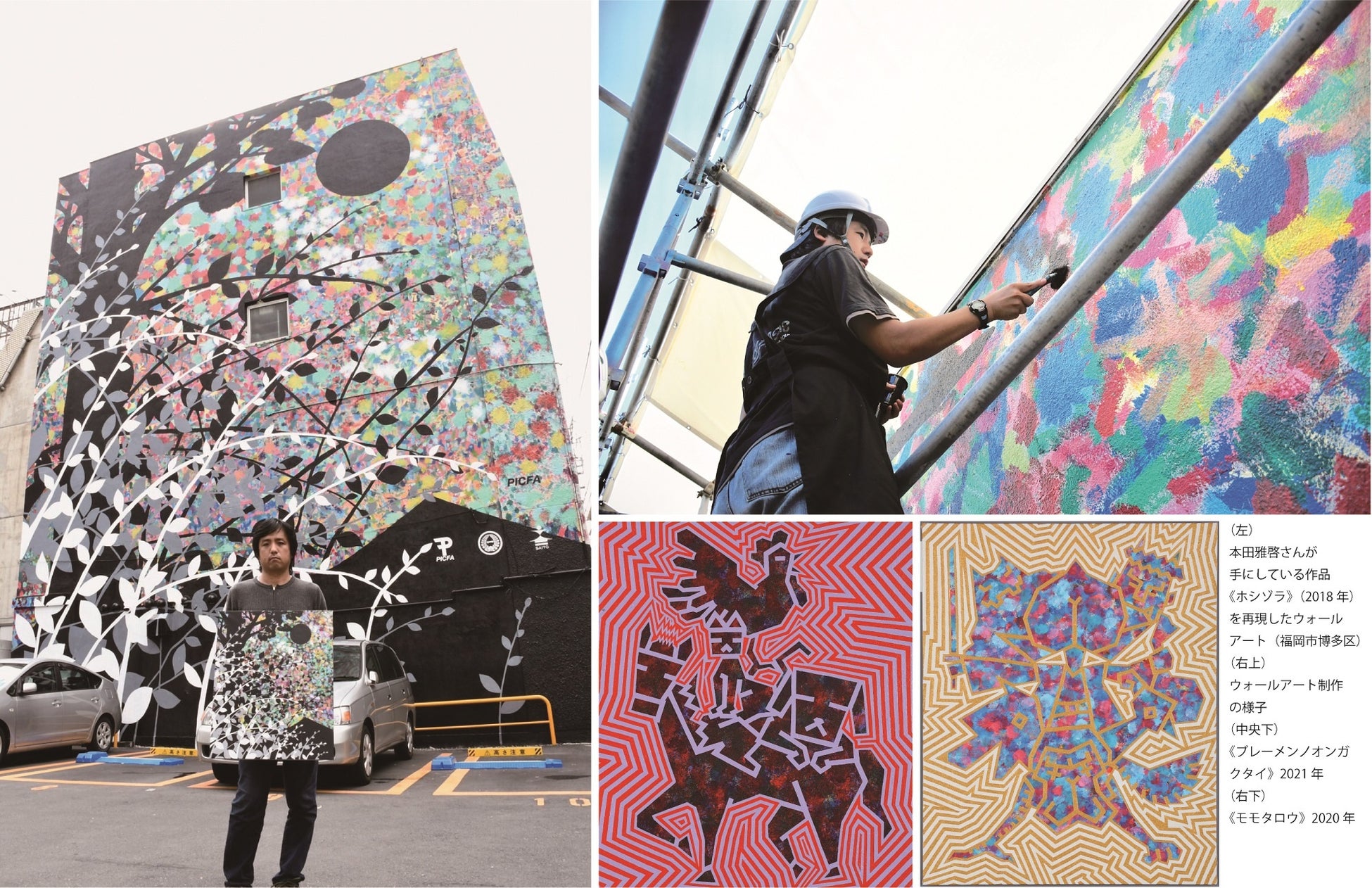 福岡県生まれ。幼少期より絵を描くことを好み、家族の勧めで高校生の頃から絵画教室に通い、卒業後は、アートを仕事にする施設を活動の場として創作を続けてきました。2018年からPICFA(※2)での活動を開始。野菜や昆虫、風景や物語のキャラクターなど様々なモチーフを、単純化した輪郭線と幾何学模様や色面を複雑に構成して描きます。正確な筆致で、ライブペインティングを得意とし、キャンバスなどの一般的な支持体だけでなく、建物の壁やシャッター、重機などにも描いてきました。主な出展歴に、「すごいぞ、これは!」展(埼玉県立近代美術館、2015年)や、「関係するアート展」(佐賀県立博物館、2021‐2022年)などがあります。