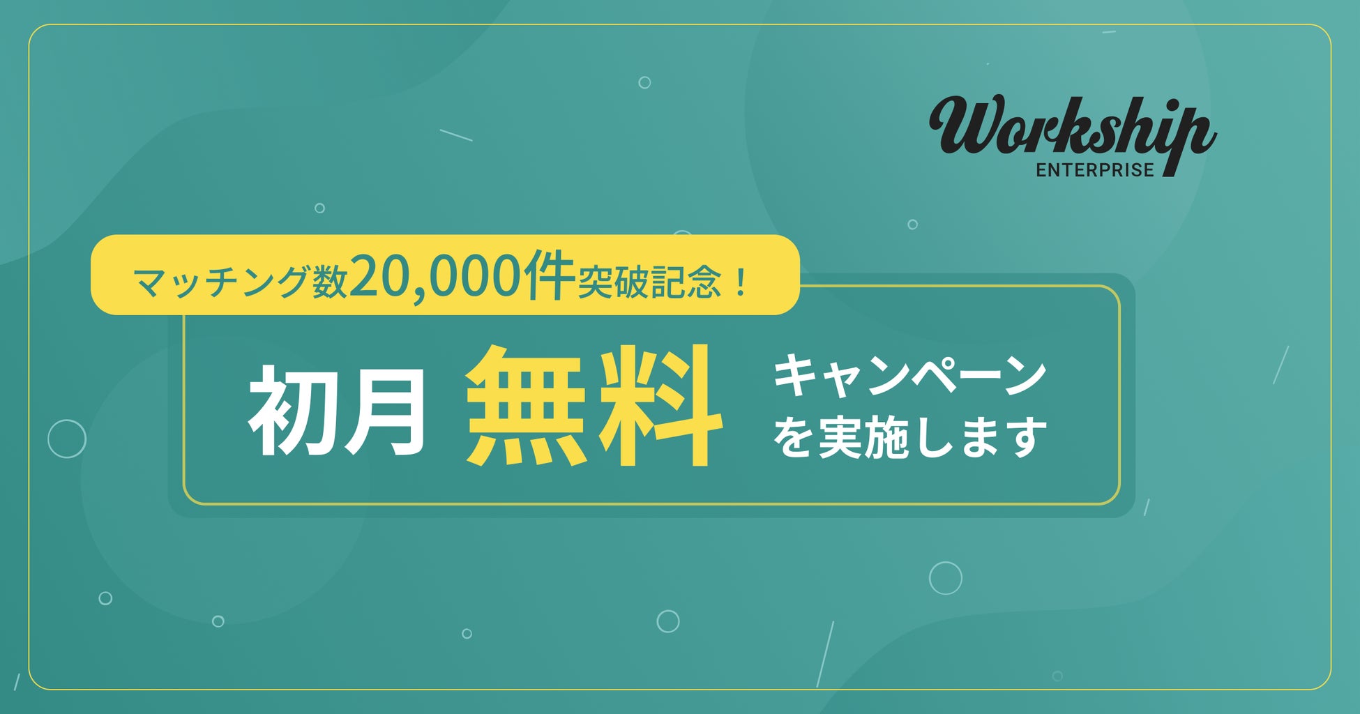 Workshipでの累計マッチング数が20,000件を突破したことを記念して、2024年8月より「初月無料キャンペーン」を開催します。