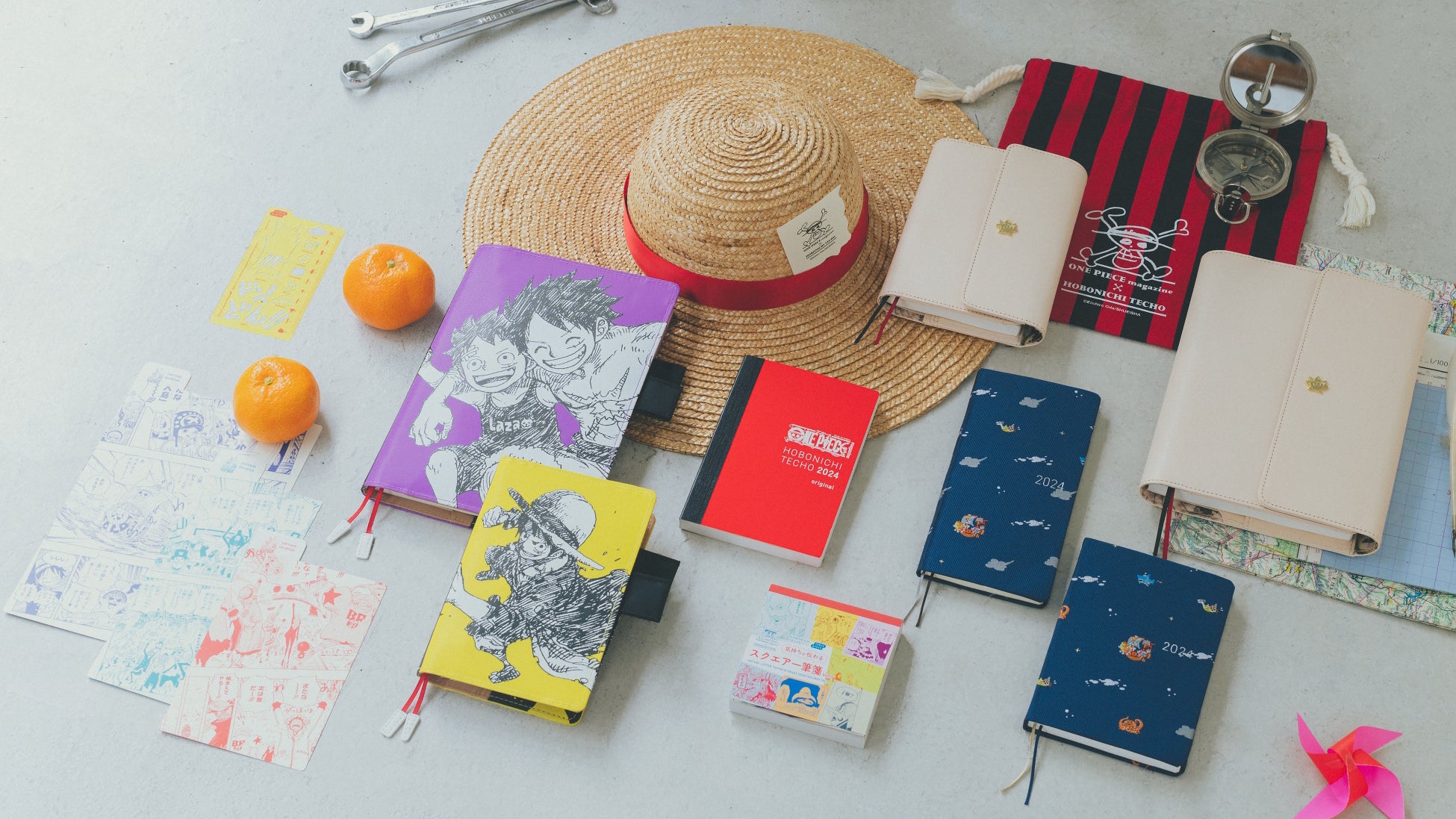 大好評だった昨年に続いて、2年目のコラボレーションが実現した2024年版。中身を刷新してパワーアップした手帳本体のほか、ルフィをプリントした手帳カバーと経年変化を楽しめるヌメ革の手帳カバー、手帳といっしょに使うとたのしい下敷きやメモ帳など、オリジナルの新作アイテムがたくさん揃いました。