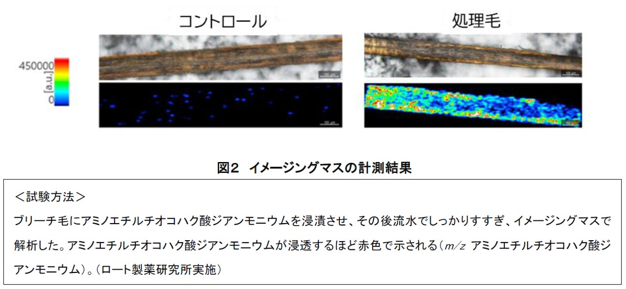 SPring-8で得られた結果より、アミノエチルチオコハク酸ジアンモニウムが毛髪内のIFに作用していることがわかりました。そこで、アミノエチルチオコハク酸ジアンモニウムが毛髪内部のどこまで作用しているかを確認するため、当社にて浸透試験を行いました。ブリーチ毛にアミノエチルチオコハク酸ジアンモニウムを浸漬させ、イメージングマスで計測しました。その結果、浸漬させたものは毛髪内部までアミノエチルチオコハク酸ジアンモニウムが浸透していることがわかりました(図2)