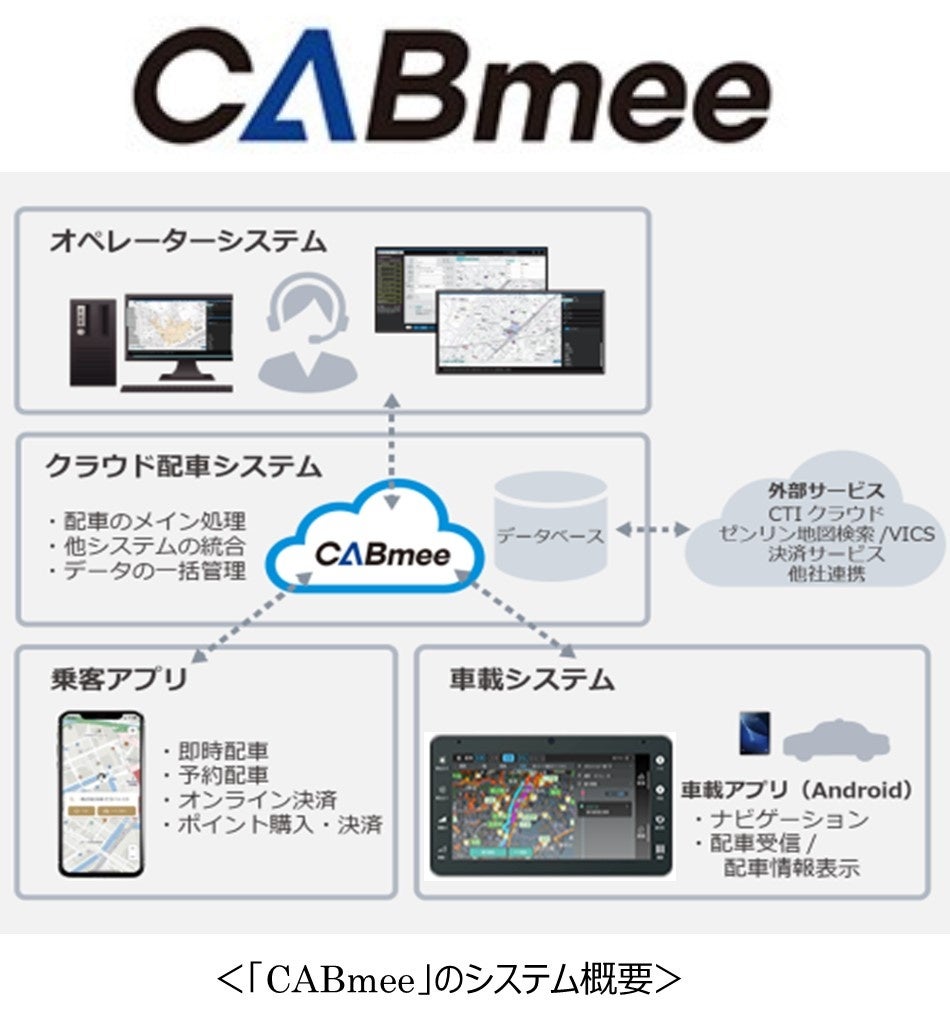 「CABmee」は、クラウドを介してオペレーターシステム、車載システム、乗客のアプリへの連動に加え、関連する他のシステムとの連携も簡単に実現できる発展性や柔軟性が強みとなっています。