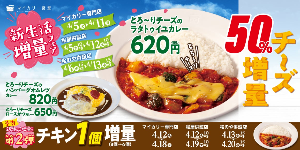 お好みでトッピングをプラスワンして『自分だけの“マイカリー”』を楽しんでもらう…そんなコンセプトから2013年に誕生したカレー専門店「マイカリー食堂」が皆さんの新生活を応援して「新生活増量フェア」を開催いたします。第1弾はとろ~りチーズ50%増量!マイカリー食堂のどのカレーとも相性抜群のチーズがいつもの1.5倍に。にんにくとオリーブオイルで炒め、旨みをギュッと詰め込んだ南欧風の野菜たっぷりトマト煮込みにカレースパイスが加わった「ラタトゥイユチーズカレー」、自慢の手仕込みロースかつがたまらない「チーズロースかつカレー」、ハンバーグのジューシーさでコクが増す「チーズハンバーグオムレツカレー」がチーズ増量対象商品です。とろ~りチーズでまろやかな味わいのカレーをぜひお楽しみください。