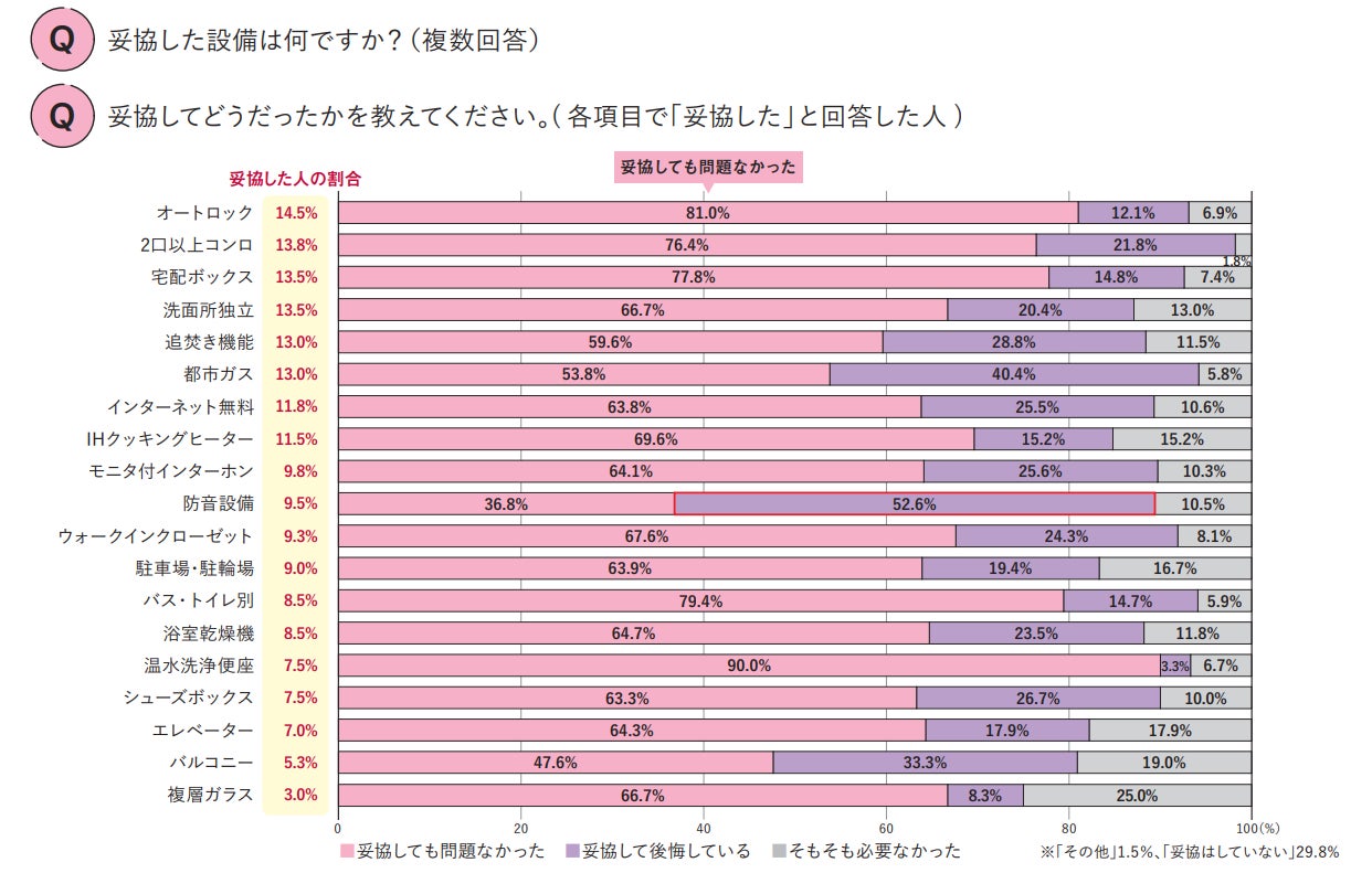 - 妥協した設備の最多は「オートロック」で、8割が「妥協しても問題なかった」と回答