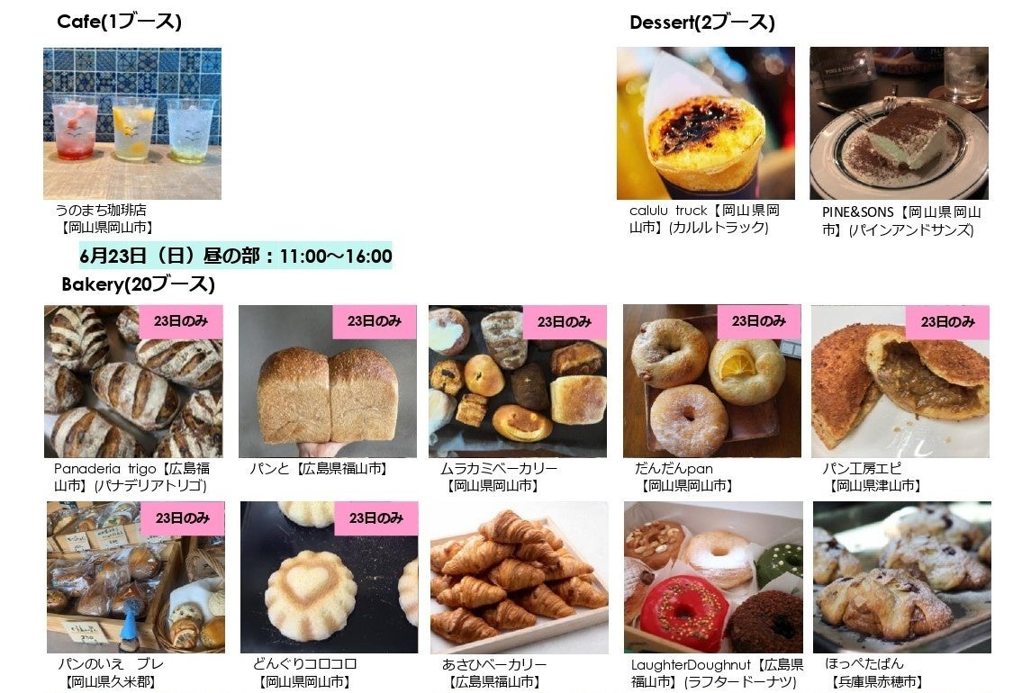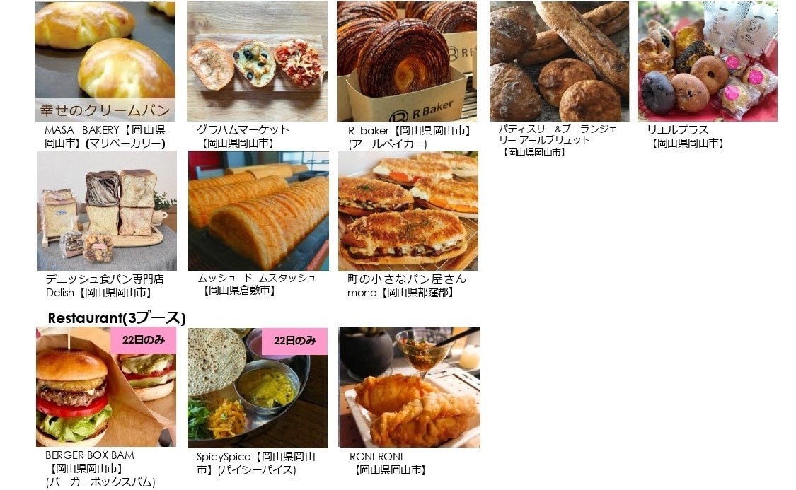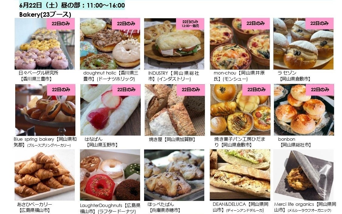 今回は、香川、広島、兵庫など岡山県外からの人気ベーカリーも初出店。素材にこだわったパンや、見た目にも可愛いドーナツのほか、イベント限定メニューなどもご用意しています。