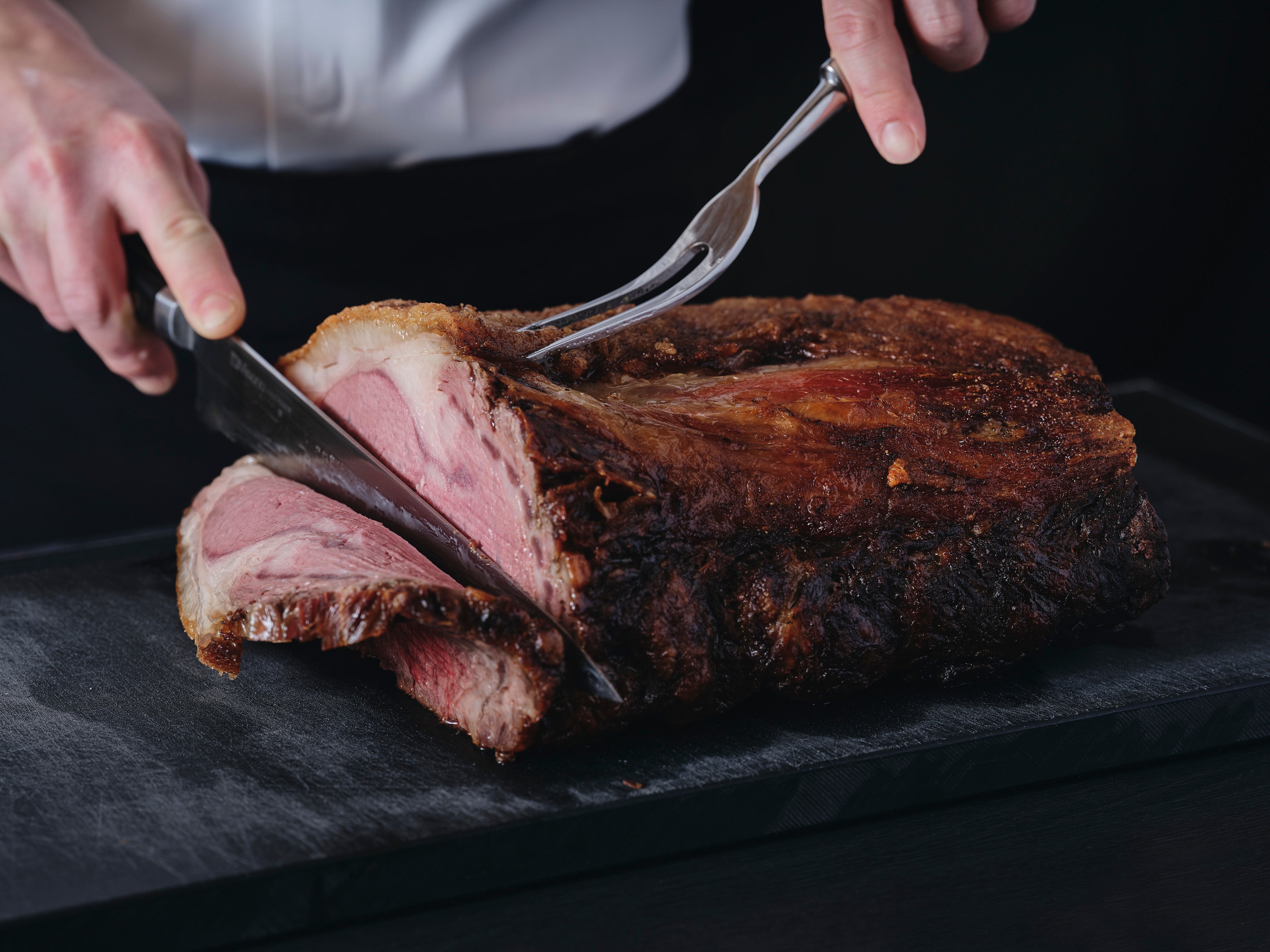 ローストビーフをメインにした 2 ヶ月間限定のコース。使用する京丹波平井牛は、長期肥育により熟成させることでオレイン酸の含有量が非常に高く、とろけるような食感が特徴です。シェフがゲストの目の前で切り分けてご提供いたします。