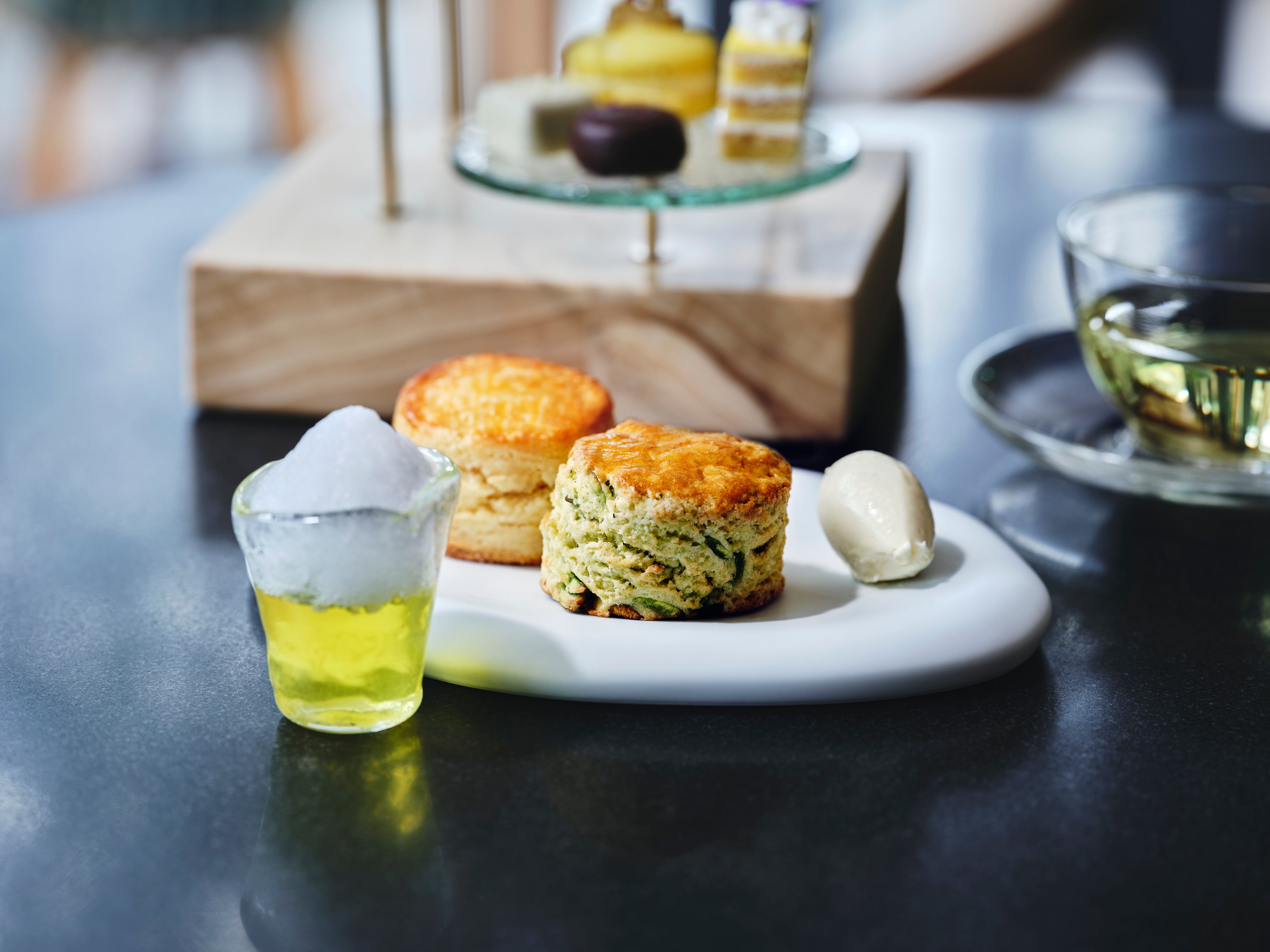 麦わら帽子をモチーフにした「マンゴーと山椒のムース」や、枝豆とビールを思わせるスコーンと紅茶の泡をあしらったレモネードの組み合わせなど、見た目にも季節感を取り入れた夏限定のアフタヌーンティー。 シェフおすすめの一品は、甘酸っぱいライチのリキュールとアセロラで 香りづけをしたババに、瑞々しいアロエの果肉、ヨーグルトベースのクリームを重ね、仕上げにライムの皮を振りかけた一品。ホテル敷地内の自社農園でとれたハーブを使ったフレッシュハーブティーを含むオリジナルティーセレクションとともにお楽しみいただけます。