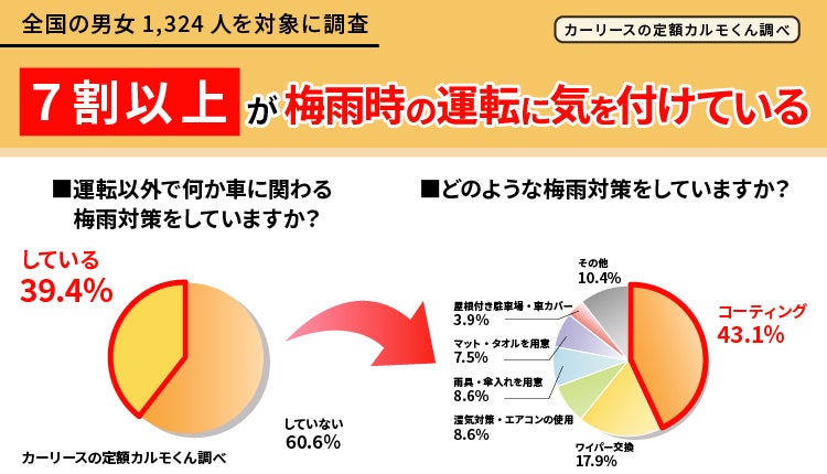 爽やかな気候の5月はドライブがより楽しくなる季節ですが、雨続きでジメジメする梅雨に向けた準備をしておきたい時期でもあります。梅雨のあいだは雨が降り続けて湿度が高くなることで、車のコンディション維持が難しくなります。また、雨の日の運転は視界が悪くなるうえ、路面が滑りやすくなるなど悪条件が重なるため、車の運転にも注意が必要です。定額カルモくんでは自家用車を所有する全国の男女1,324人を対象に、梅雨の運転で気を付けていることはあるか、また、車の梅雨対策や梅雨時期の洗車頻度などについて、インターネット調査を行いましたのでご紹介します。