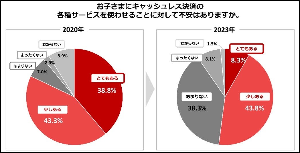 まず、「お子さまにキャッシュレス決済の各種サービスを使わせることに対して不安はありますか。」という設問において、2020年では「(不安が)とてもある」「(不安が)少しある」を合わせて82%に対し、今回の調査では52%に減少しました。キャッシュレスについての話題が盛り上がっていることもあり、不安がある保護者は半数まで減っていることが分かりました。