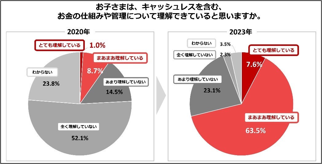 また、「お子さまは、キャッシュレス決済を含む、お金の仕組みや管理について理解できていると思いますか。」という設問においては、「できていると思わない・わからない」という回答が2020年は90%以上を占めていたのに対し、今回の調査では、「理解している」という回答が70%以上を占めるなど、世界的なトレンドや政府の取り組みなどによって、未成年の間でもマネーリテラシーが上がってきているということが分かりました。