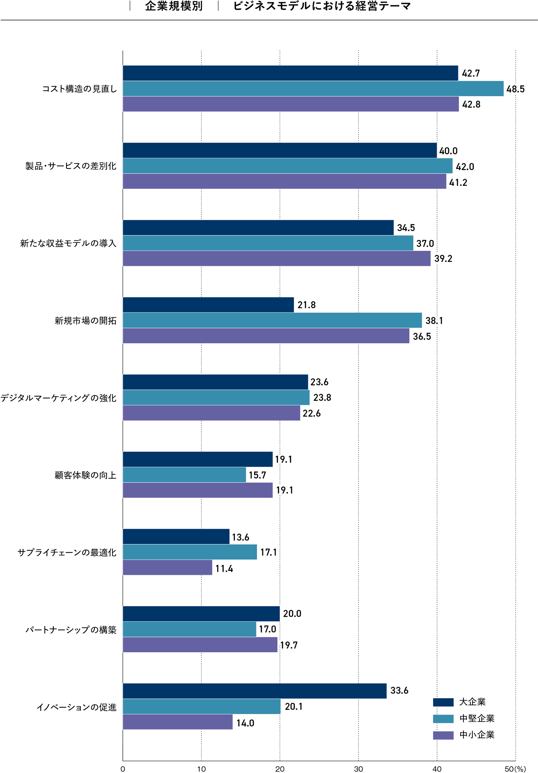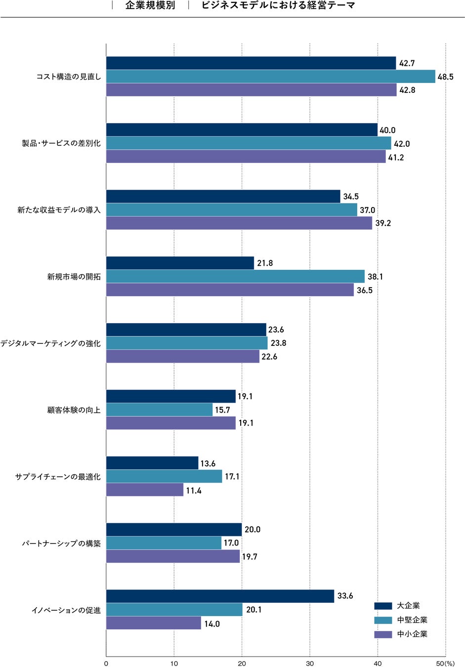 (4)ビジネスモデルの再構築に向けた重点テーマは、全企業規模で「コスト構造の見直し」と「差別化」が上位に