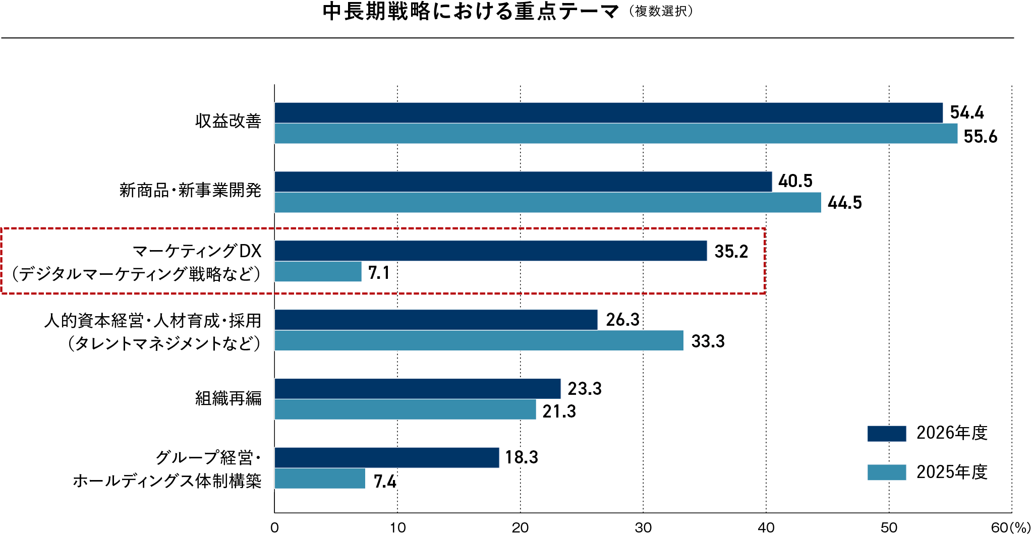 (2)中長期戦略の重点テーマでは「収益改善」が54.4%で最多となりました。注目すべきは「マーケティングDX」で、前年の7.1%から35.2%へ大幅に上昇しており、成長戦略における顧客接点の高度化への関心が急速に高まっております。