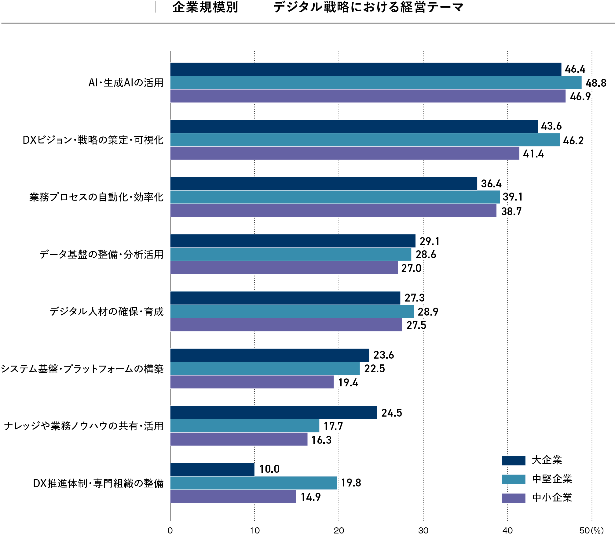 デジタル戦略における経営テーマを見ると、企業規模を問わず「AI・生成AIの活用」が最上位に位置しており、大企業46.4%、中堅企業48.8%、中小企業46.9%といずれも高水準となっております。あわせて「DXビジョン・戦略の策定・可視化」や「業務プロセスの自動化・効率化」も各規模で上位に挙げられており、デジタル戦略の方向性を定める取り組みと業務変革の具体化が並行して進められていると分かります。企業規模別に見ると、大企業では「ナレッジや業務ノウハウの共有・活用」(24.5%)が相対的に高く、部門横断でのデータや知見の活用を通じた全社的なDXが進展しております。中堅・中小企業では「業務プロセスの自動化・効率化」や「AI・生成AIの活用」への関心が高く、現場業務の効率化や生産性向上を起点とした実務ベースのデジタル活用が中心となっております。なかでも中堅企業では、戦略設計と現場活用を並行して進める傾向が見られ、全社展開を見据えた段階にあることが特徴的です。