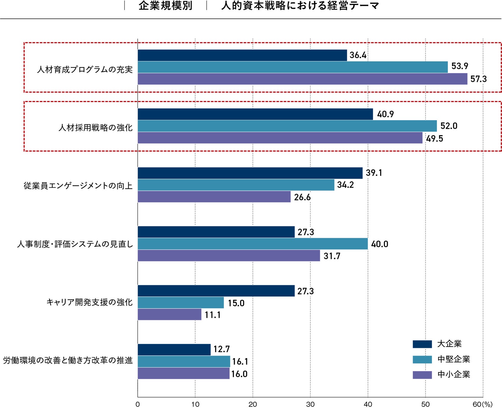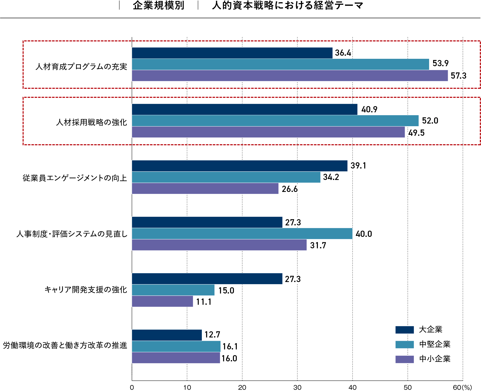 (6)人的資本戦略における経営テーマは、人材育成・採用が引き続き最重要課題、大企業・中堅企業では「定着と活躍」、中小企業は「確保と育成」に注力