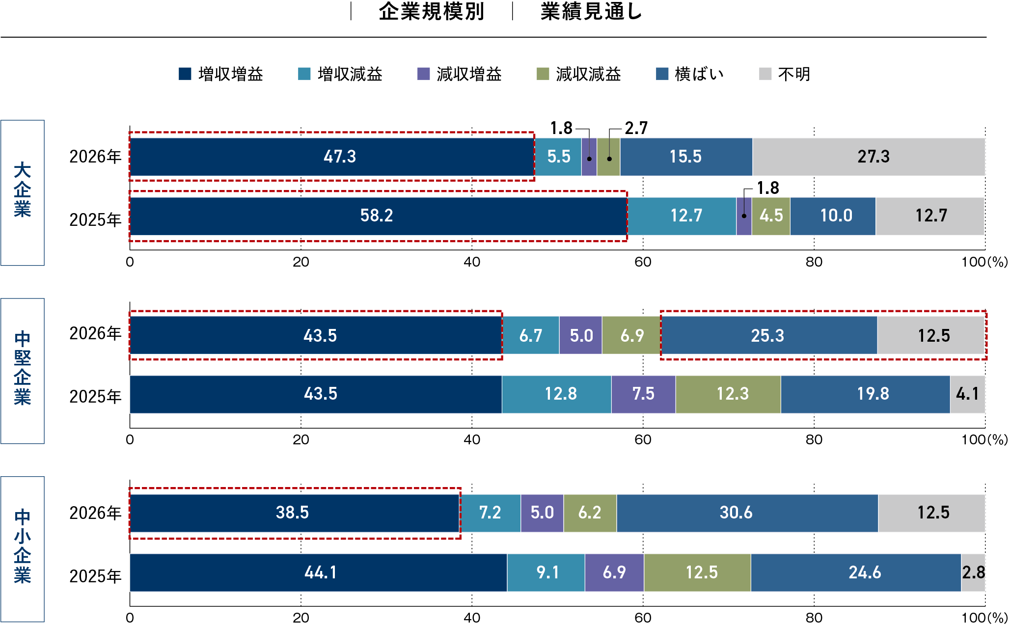(1)企業規模別の業績見通しでは、2025年度は全企業規模で「増収増益」が最多となりました。一方、2026年度は大企業の「増収増益」が47.3%(前年比▲10.9ポイント)に減少するなど、世界情勢の不確実性を背景に慎重な見方が広がっております。