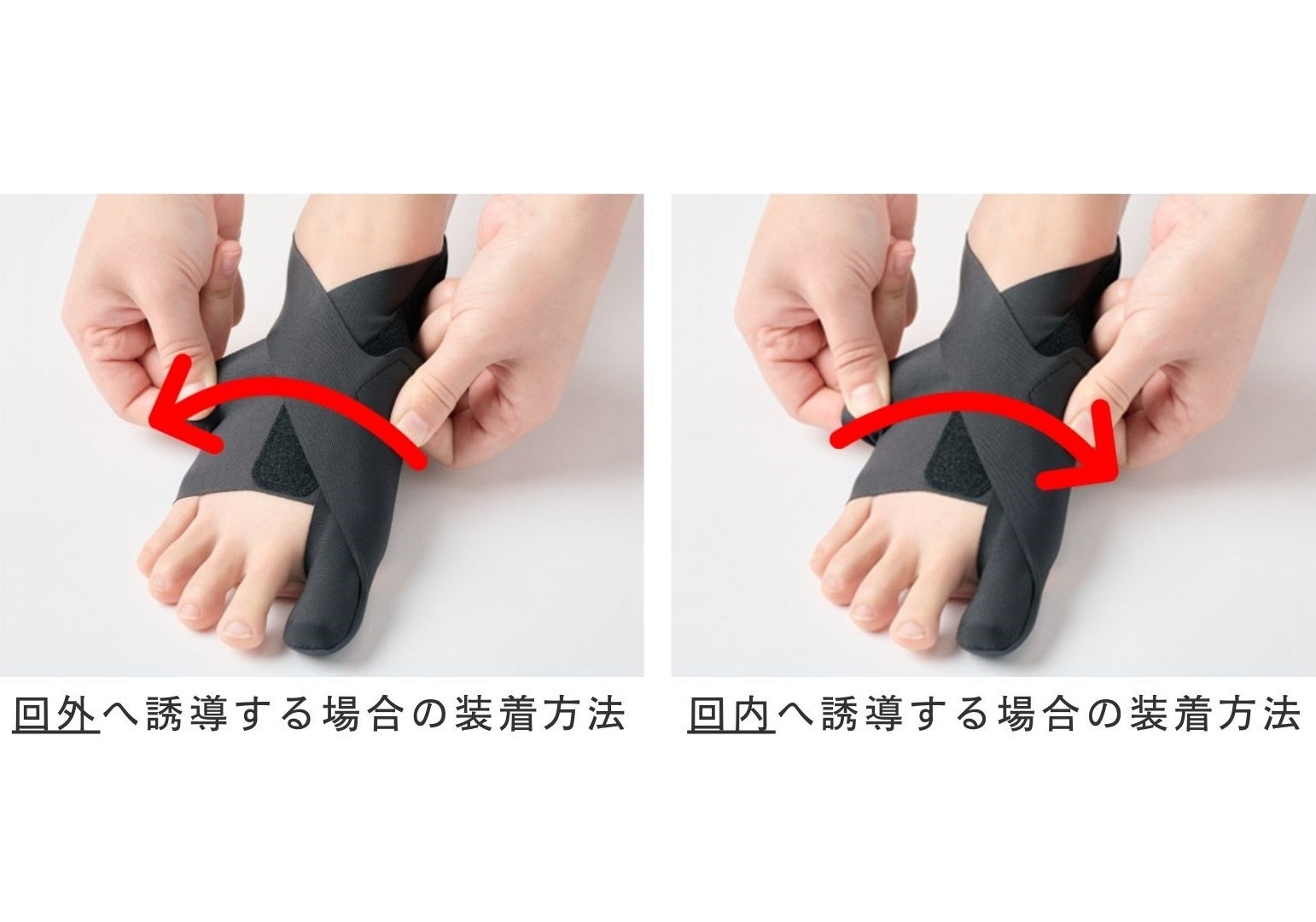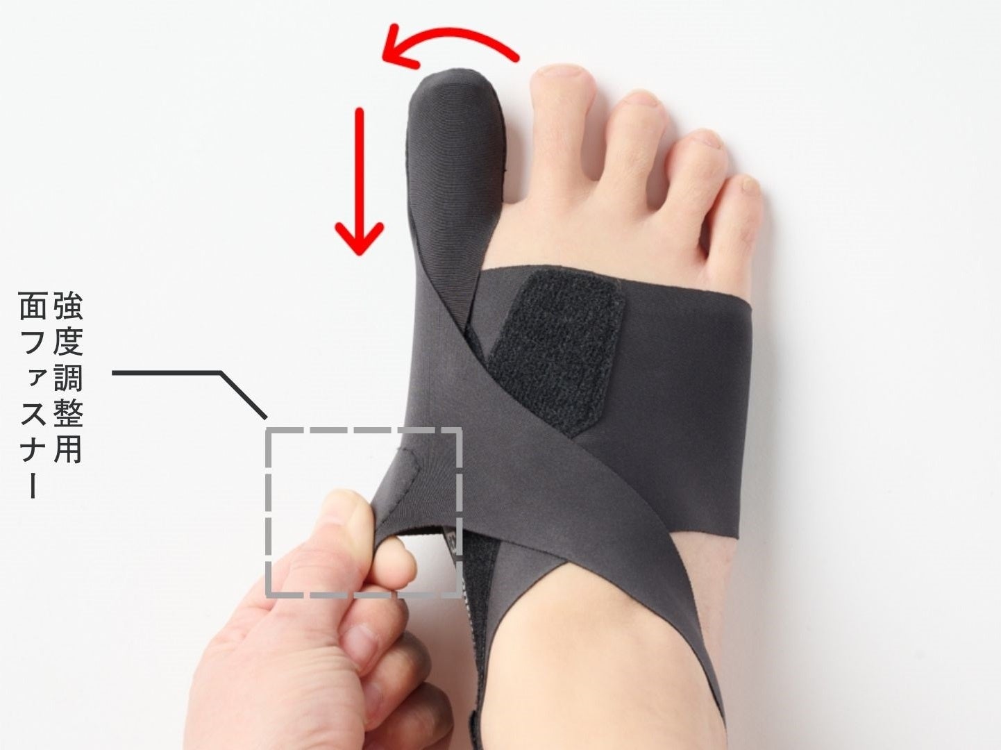 面ファスナーを引っ張ることで、内側に入った親指を外側に開きます。面ファスナーをとめる位置で、サポート力を調整できます。