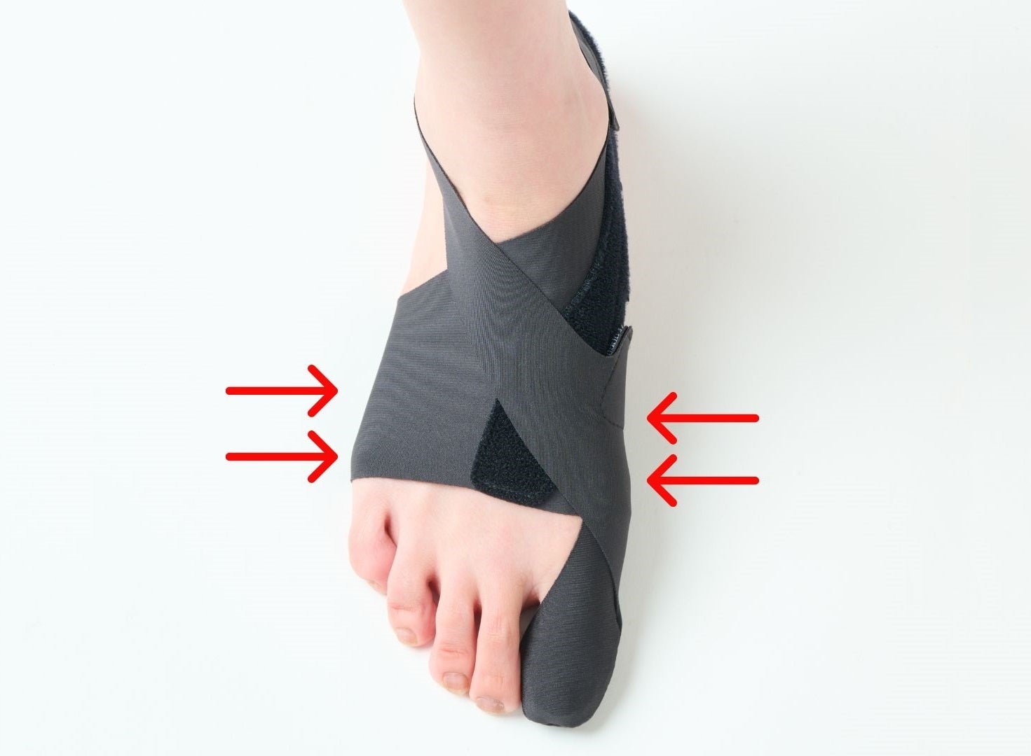甲周囲を絞り、横アーチをつくることで足指が使える歩行へ誘導します。また、横アーチをつくることは、親指を開くための重要な働きの1つです。