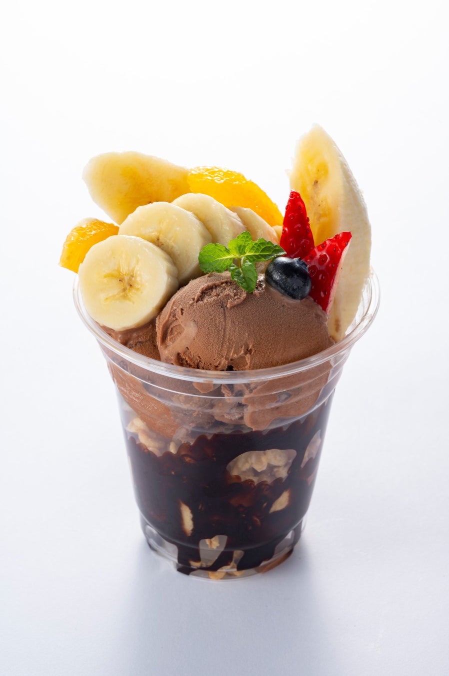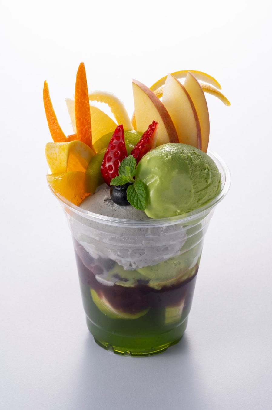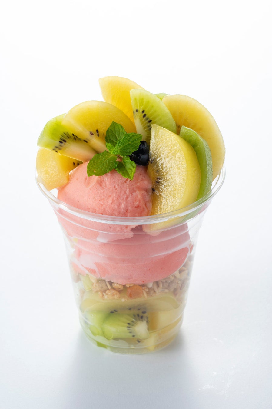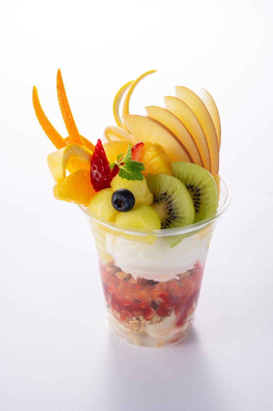 羽田エアポートガーデン店では、看板商品の「金澤パフェ」をはじめ、フルーツジュレやジェラート、カットフルーツなど、約30種類の商品を取り揃えます。さらに、フルーツジュース・ジェラート・カットフルーツを一度に楽しめる新商品も登場。旬の果物の美味しさをさまざまな形で味わっていただけます。