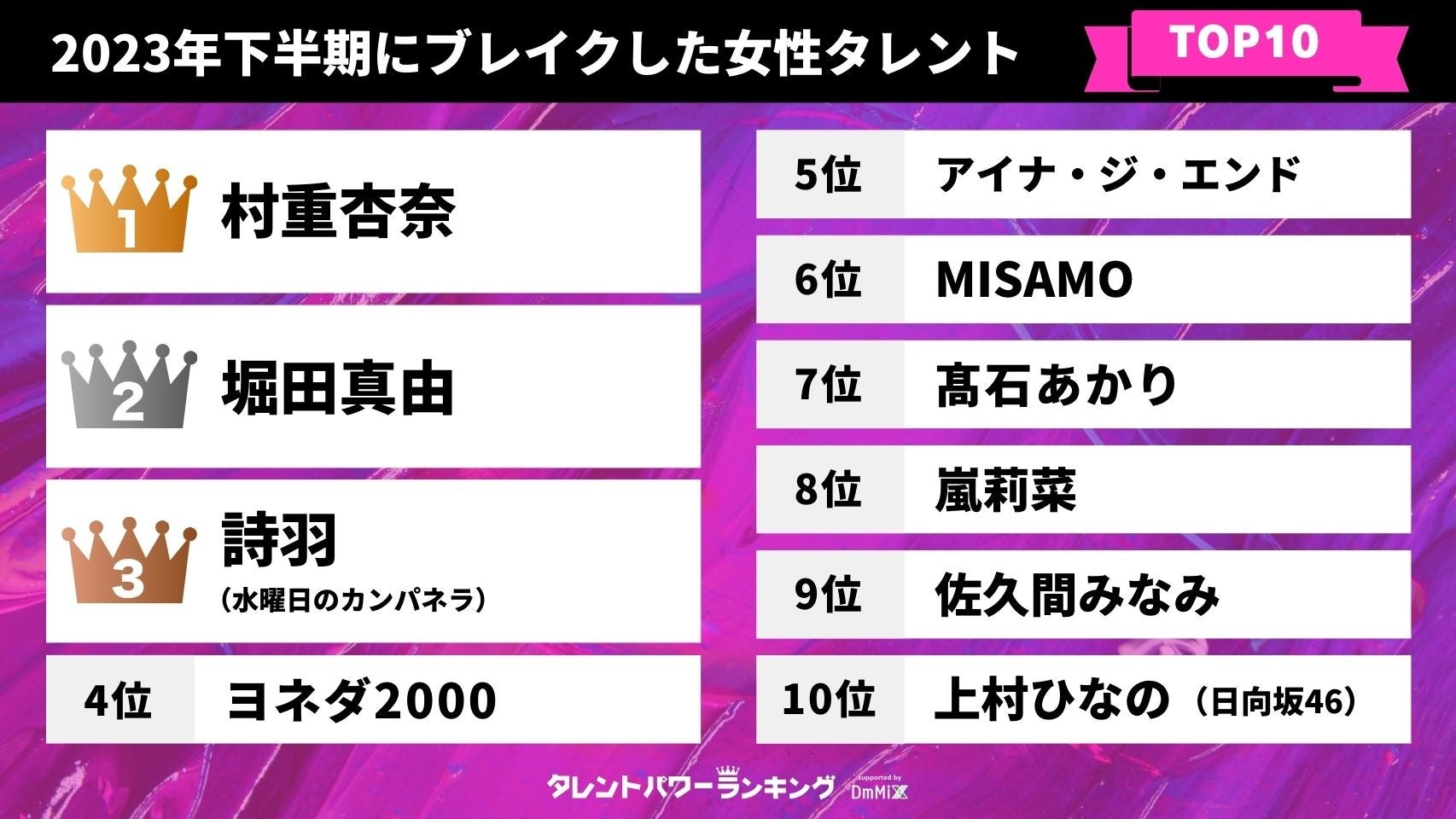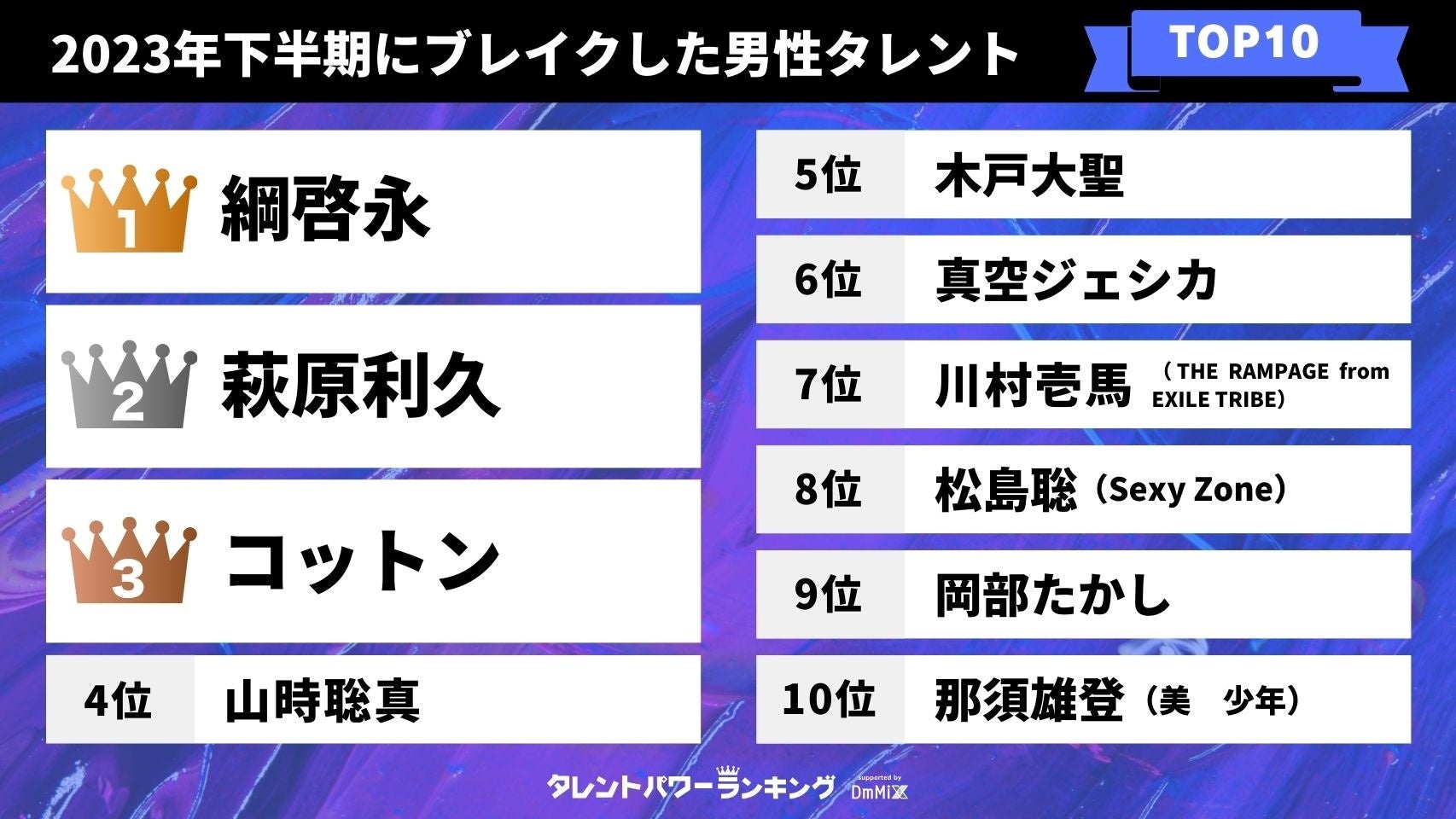 『タレントパワーランキング』では、様々なジャンルで2023年下半期に活躍しブレイクしたタレントについて、男女別でそれぞれランキング形式にまとめました。