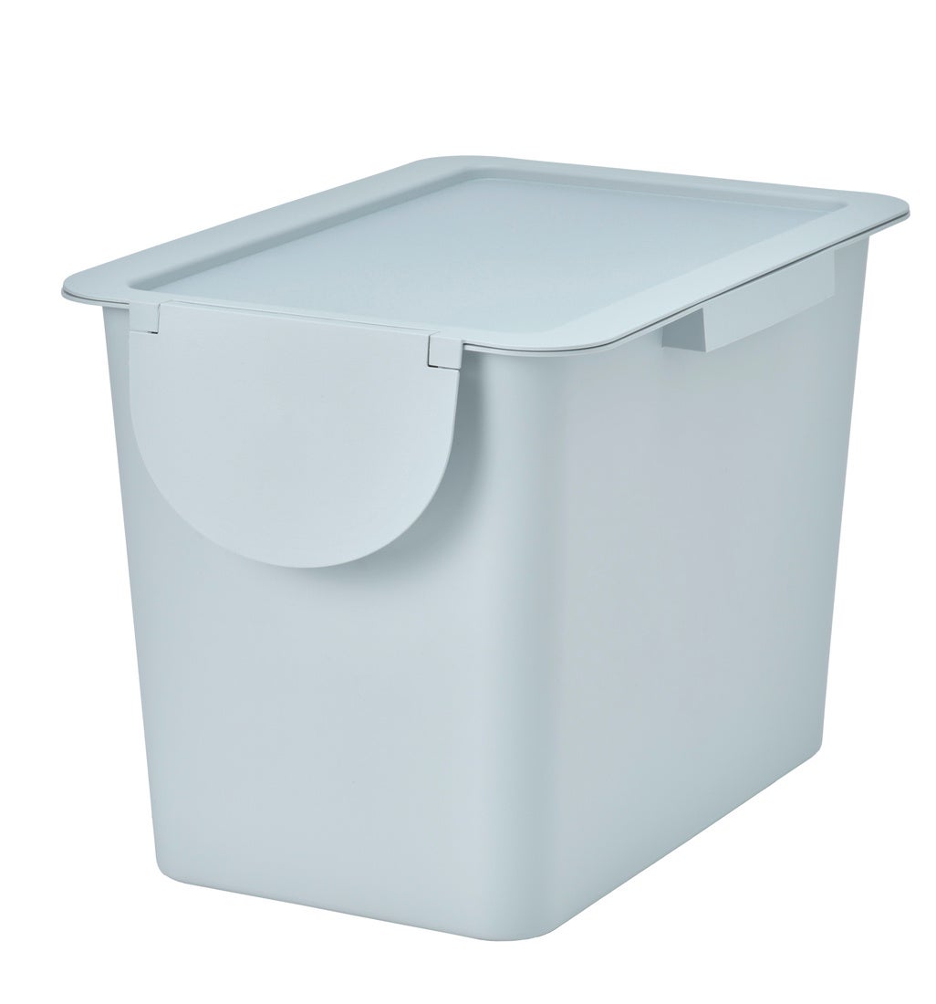 TRÖSKNING/トロスクニング ふた付き容器は、プラスチックや金属、紙、ガラスといった乾燥廃棄物を分別できるデザイン。ガーデニング用品やレジ袋などの収納にも使えます。このゴミ箱とふたに使われているプラスチックには、リサイクル材料が50%以上含まれています。