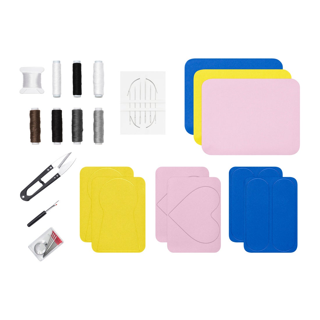セット内容:はさみ1本、指ぬき1個、糸通し1個、シームオープナー1本、マチ針10本、針6本、カーブ針2本、太糸(30m)5点、細糸(30m)2点、透明糸 (30 m) 1点、アップリケ9点