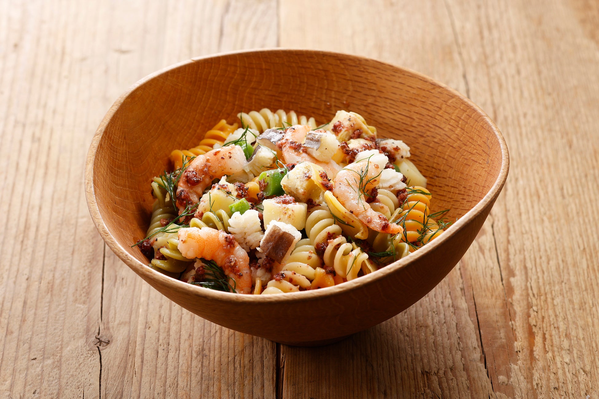 近畿地方の夏の風物詩である「鱧」と梅の食べ合わせに着想を得た一品。鱧、シュリンプ、ポテト、アーティチョークを、赤紫蘇のような香りが特徴の中東のスパイス『スマック』風味のドレッシングで仕上げたパスタサラダ。
