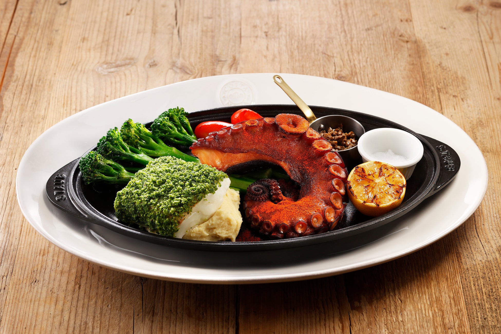 近畿地方が世界に誇る「近江牛」、愛媛県真鯛の香草パン粉焼き、タコのコンフィを一度に楽しめるシズラー渾身のサーフ&ターフ。