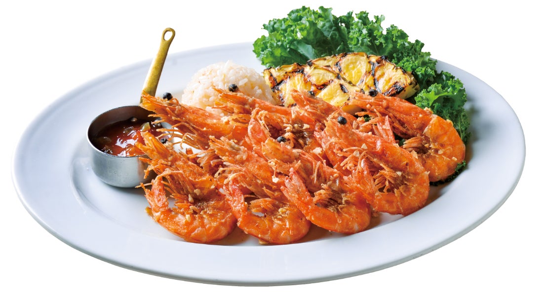 昨年の夏にフェア商品として展開したハワイアンガーリックシュリンプが今年も登場!脱皮したての殻の柔らかい「ソフトシェルシュリンプ」を使用しており、殻ごとお召し上がりいただけます。ガーリックライスとグリルパイン・ケールをそえてボリューム感のある一品です。