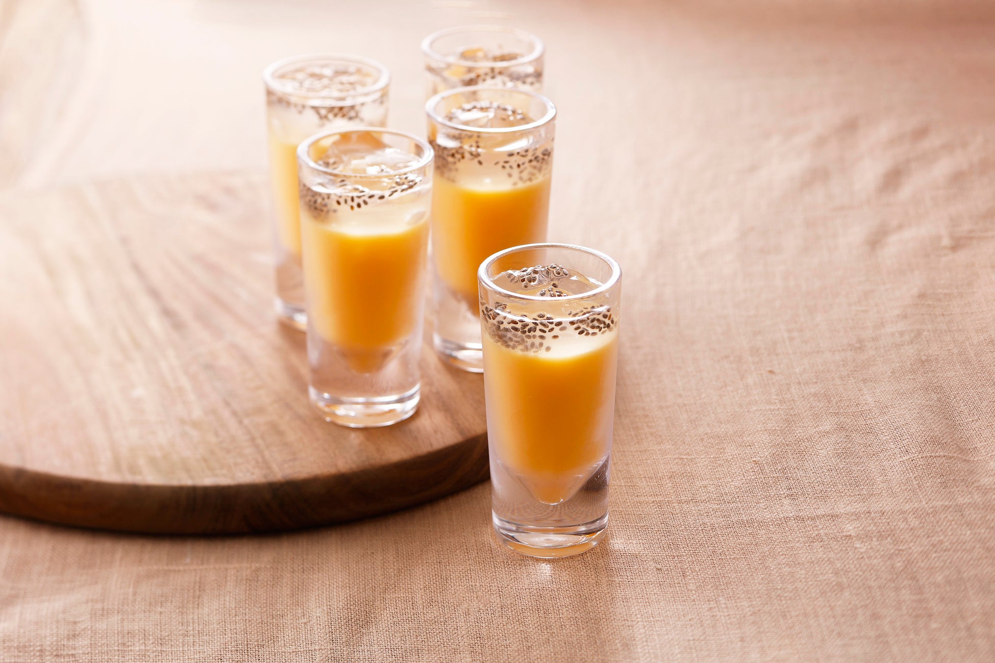 マンゴープリンに、チアシード入りのライチジュレを合わせた見た目にも涼やかなデザート。
