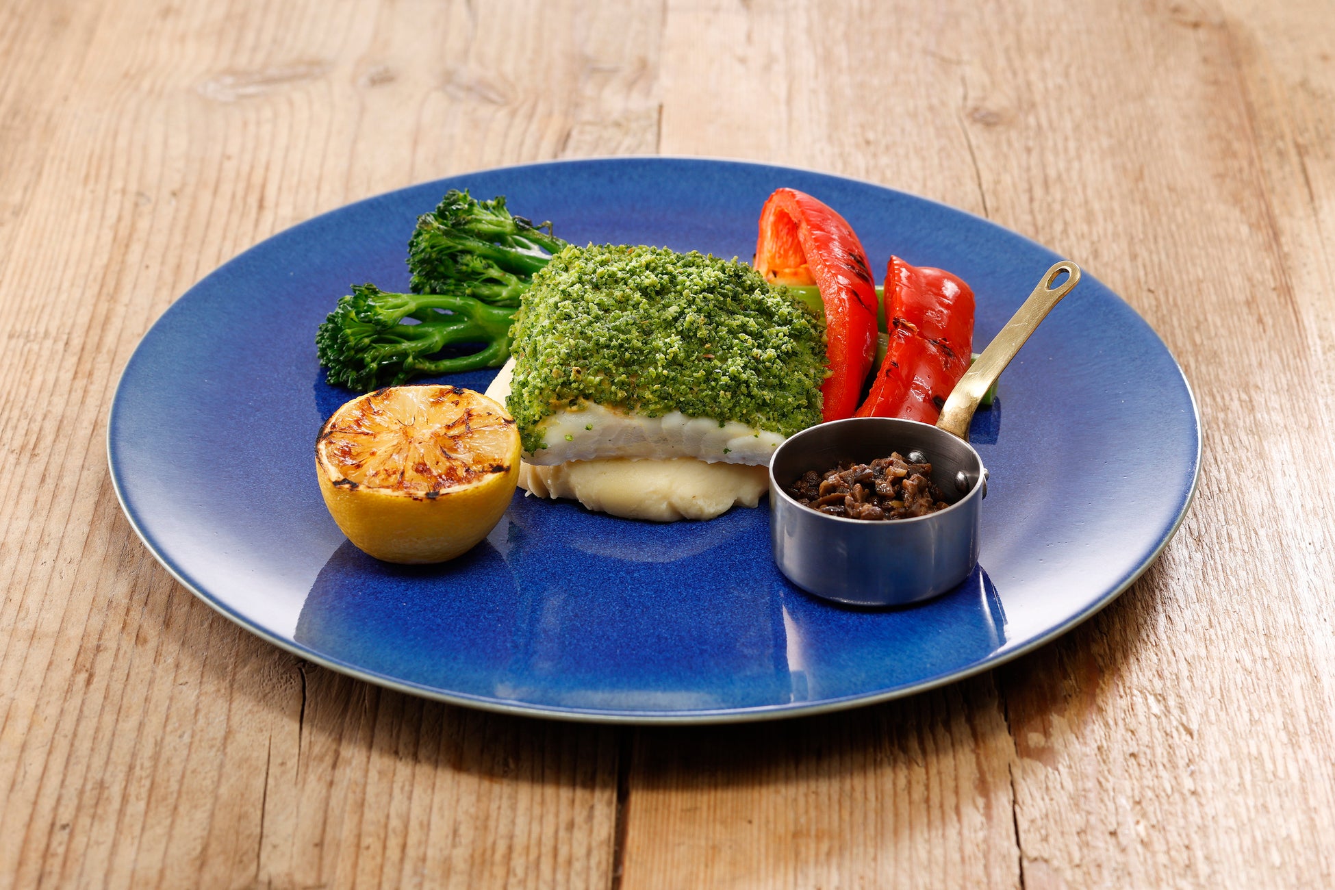 宇和の豊饒な海で育った愛媛県産真鯛に香草パン粉をのせ、オーブンでふっくら焼き上げました。グリルレモンを絞ってどうぞ。