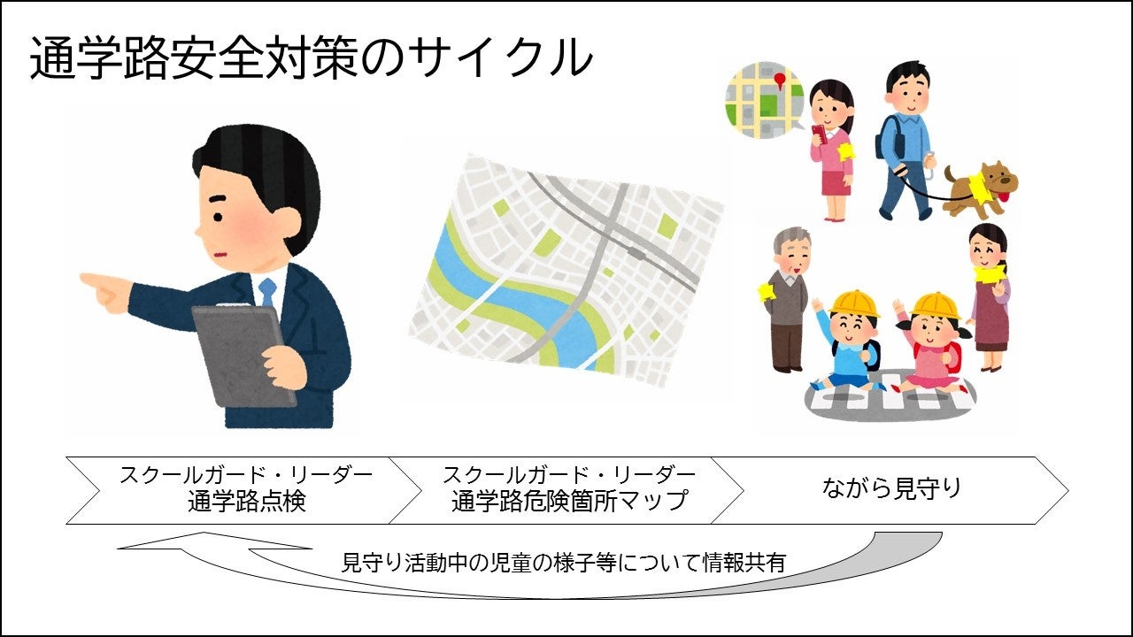 新たに配置した「スクールガード・リーダー」によりマップの作成・更新等が行われ、「ながら見守り活動」ではこのマップをもとに見守り活動を行います。