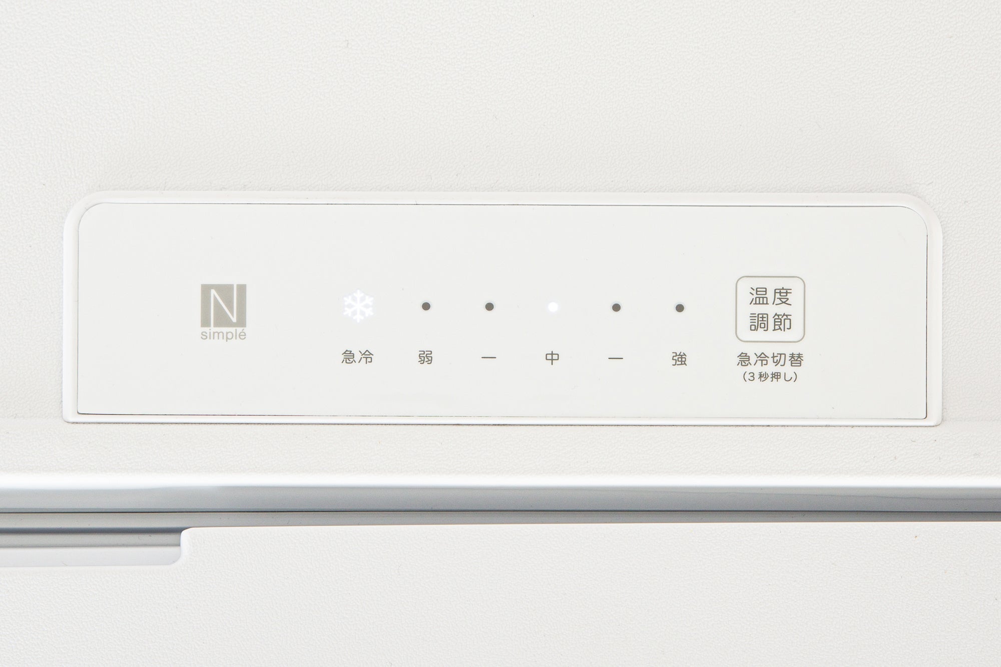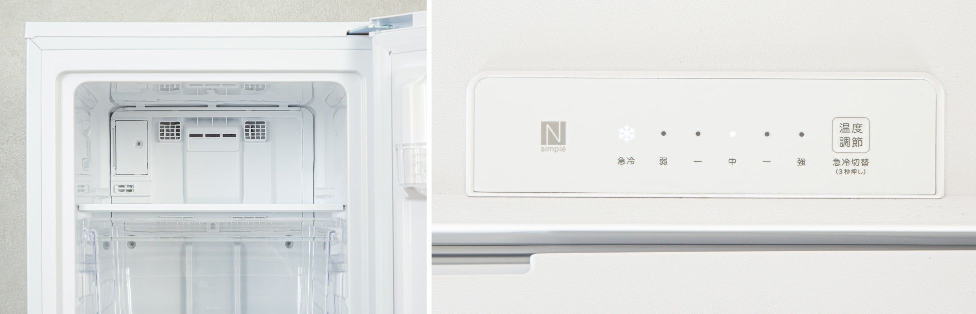 ファン式タイプで自動霜取り機能付き。冷気を全体にムラなく広げ自動で霜取りを行うのでお手入れが簡単です。操作パネルで庫内の温度調整が可能(弱・中・強)です。※