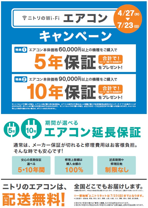 期間中、店頭にて本体価格60,000円(税込)以上の機種をご購⼊いただくと、5年保証(メーカー保証1年+延⻑保証4年)をプレゼント。本体価格90,000円(税込)以上の機種をご購⼊いただくと、10年保証(メーカー保証1年+延⻑保証9年)をプレゼントいたします。ニトリネットでご購⼊の場合は、配送料⾦・延⻑保証料⾦相当分のメンバーズ・ アプリ会員ポイントを付与いたします。詳細は下記ページをご確認下さい。