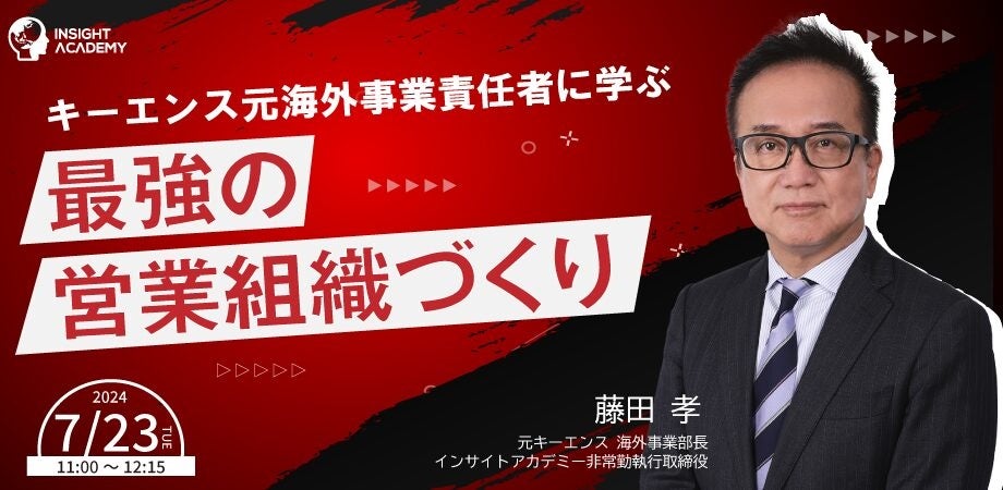 グローバル⼈材育成・研修業を⼿掛けるインサイトアカデミー株式会社(本社:東京都港区新橋、代表:金 珍燮)は、無料webセミナー「キーエンス元海外事業責任者に学ぶ 最強の営業組織づくり」を2024年7月23日(火)11:00より開催します。