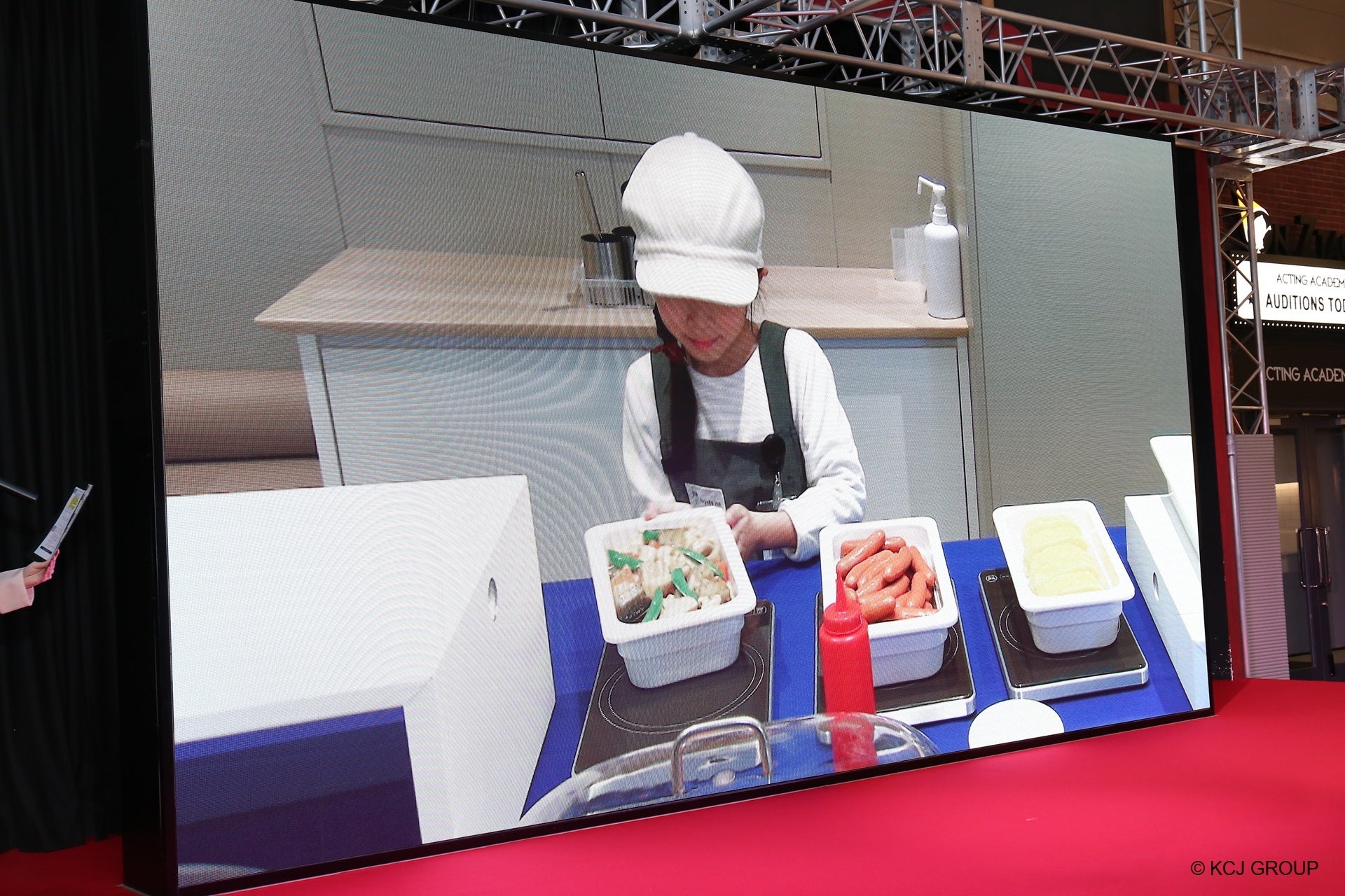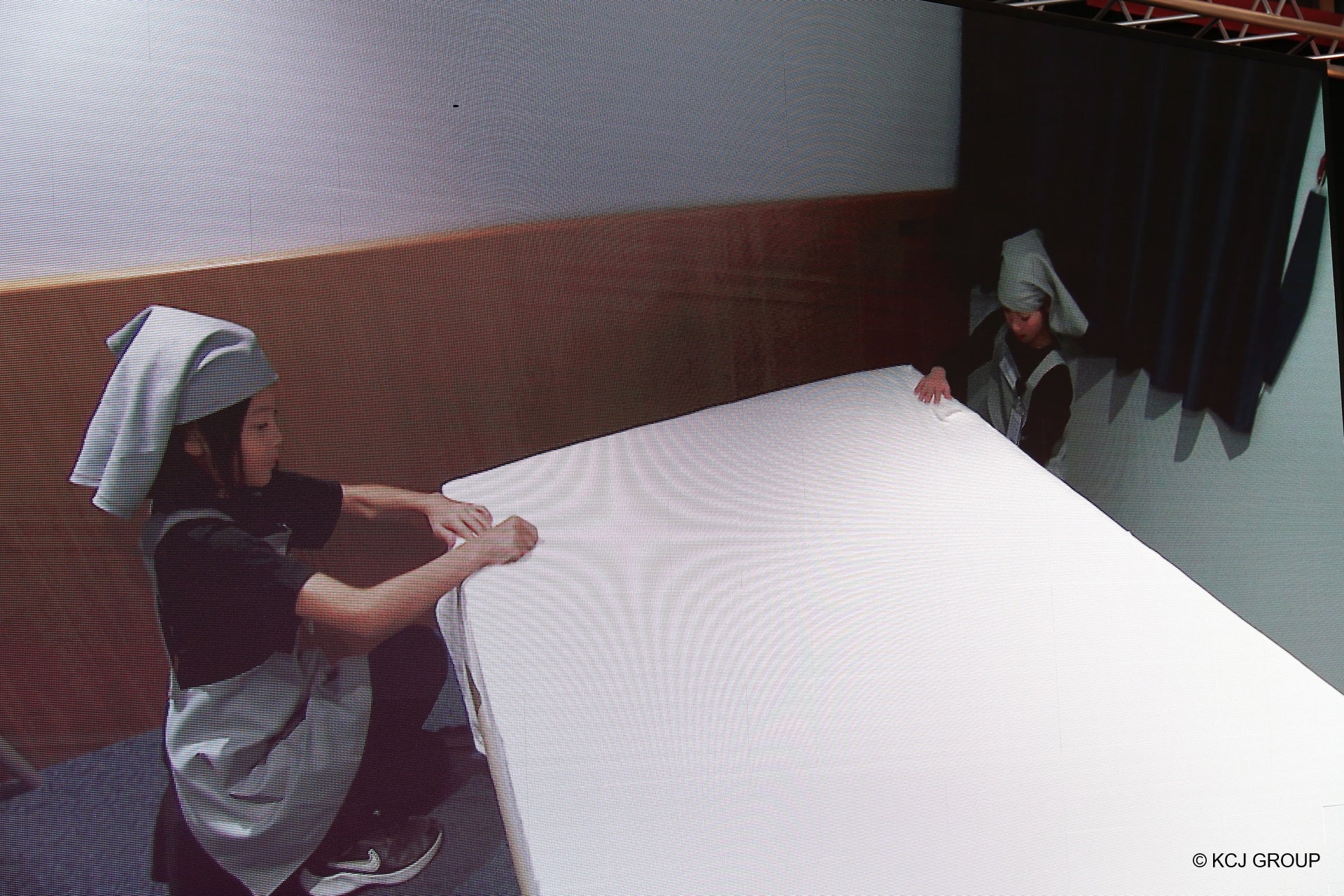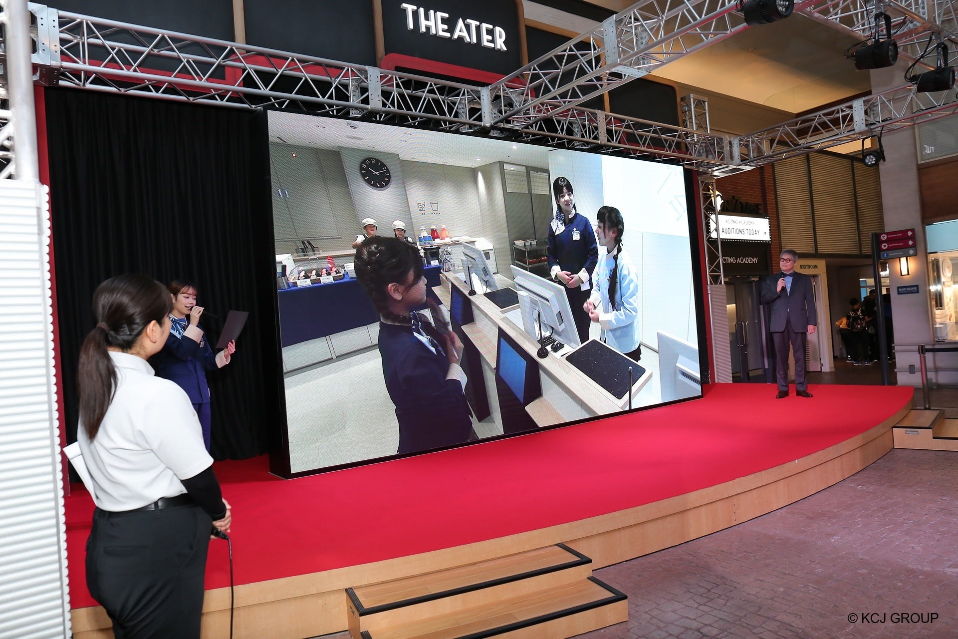 モニター中継でこども達が「ホテル」パビリオンの3つの仕事をそれぞれ体験している様子を紹介しました。まず、フロントでは、こども達が「ホテリエ」としてお客さまをあたたかくお迎えするため、笑顔や姿勢を練習しているところが映し出され、続いて朝食ビュッフェのエリアでは、こども達が「パントリースタッフ」として朝食ビュッフェの準備を協力して行っている様子が中継されました。最後に客室では、こども達が「メイクスタッフ」としてベッドメイクを行いシーツを綺麗に整えているところが紹介されました。