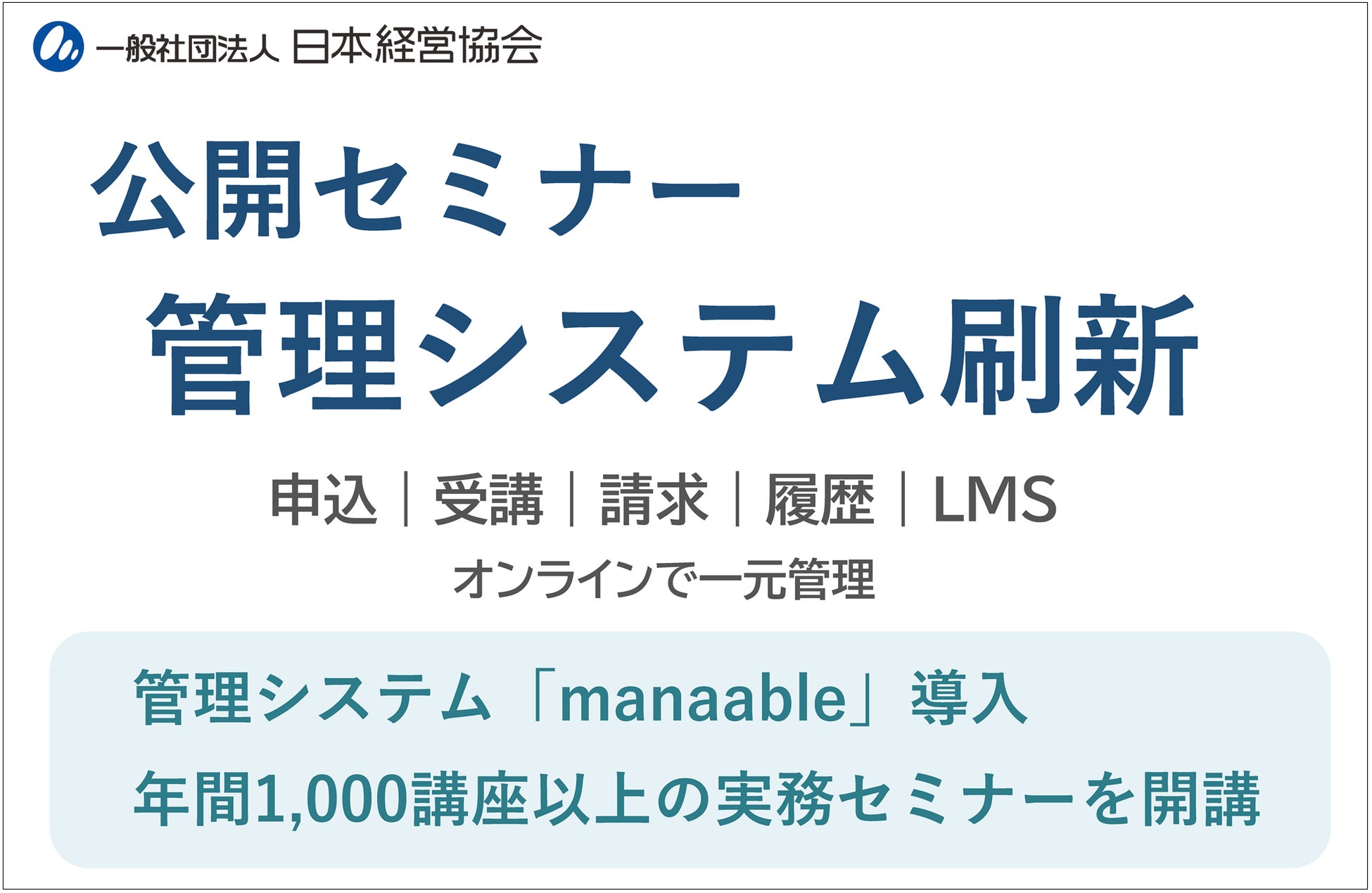 一般社団法人日本経営協会(本部事務局:東京都渋谷区、会長:高原 豪久)は、公開セミナー事業において、受講者および組織のセミナー担当者の利便性向上を目的に、セミナー申込から受講、請求管理までをオンラインで一元管理できる新システム「manaable(マナブル)」を2026年3月6日に導入いたしました。2026年4月開講のセミナーより順次利用を開始いたします。