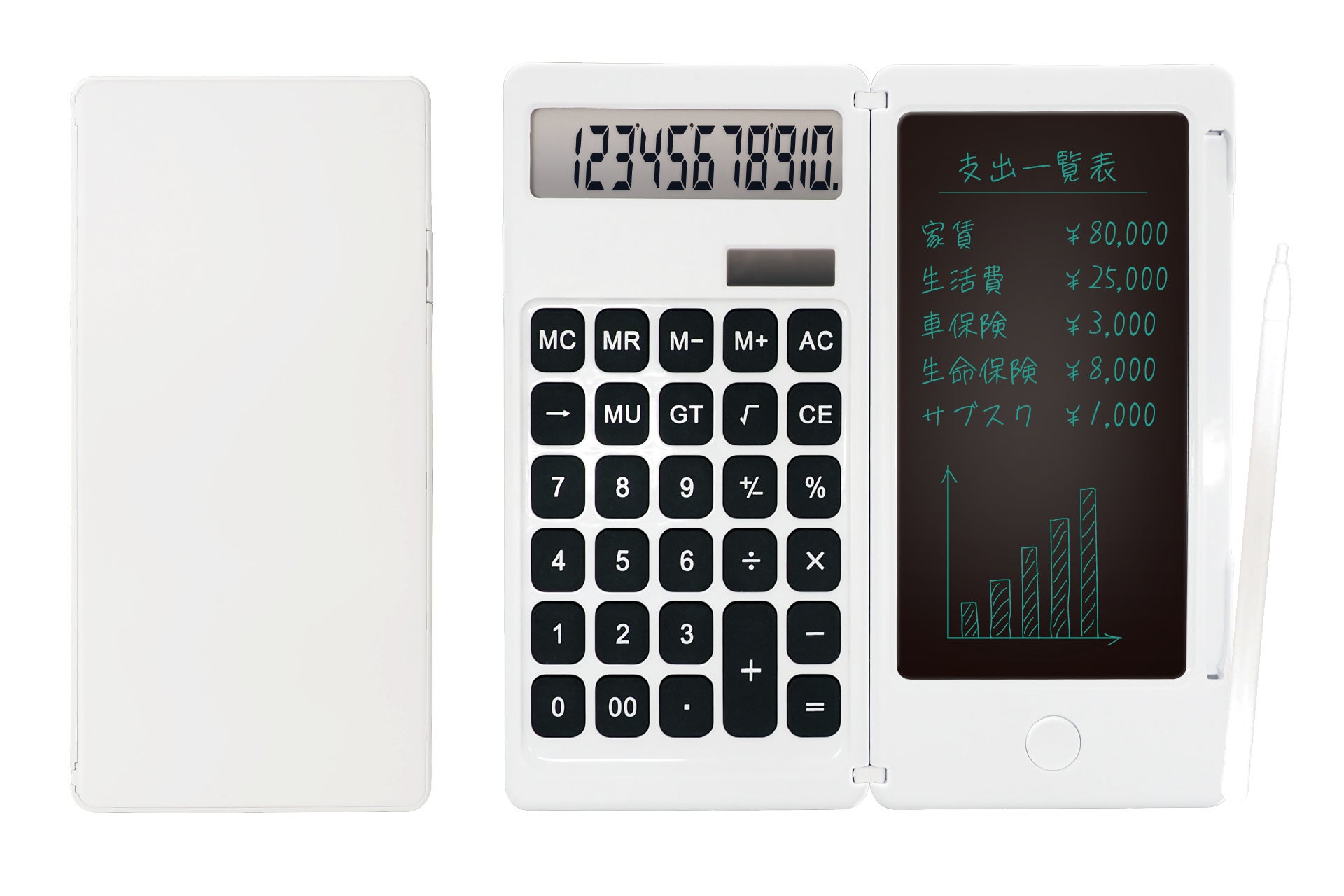 特徴:計算も手書きメモもこれ1台で完結!電卓付き電子メモパッドです。画面を守ってピタッと閉じるマグネット式、薄型・軽量で持ち運びも安心です。電卓部分はソーラーパネル搭載、メモパッドには本体に収納可能な専用ペン付き!