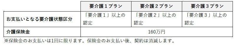 保障内容およびプラン:被保険者様が要介護状態となり、公的介護保険制度の要介護1、2または3以上と初めて認定されたとき、一時金として保険金160万円をお支払いします。
