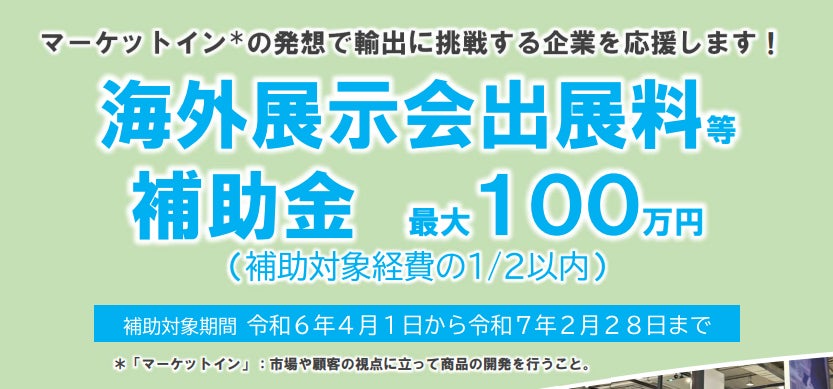 本日5月8日から「海外展示会出展支援事業補助金」の募集を開始しました。県内中小企業の皆様の積極的なご応募をお待ちしております。