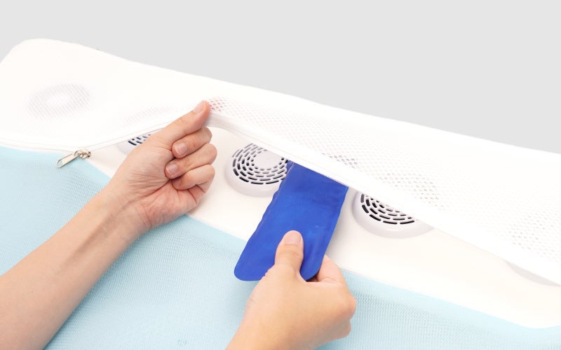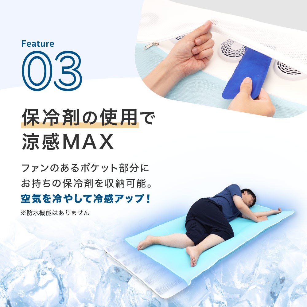 さらに、マットのポケットに保冷剤を入れることで、風の冷たさを強化することも可能です。