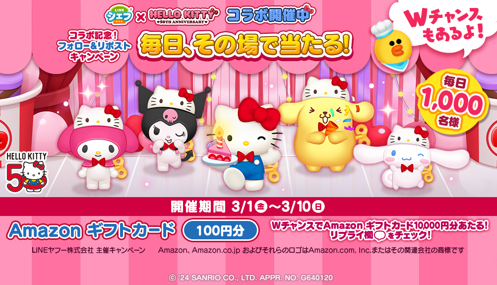 期間中、「LINE シェフ」公式X(旧Twitter)をフォローしてキャンペーン投稿をリポストすると、毎日抽選で1000名様にAmazonギフトカードが当たるXフォロー&リポストキャンペーンを開催します。奮ってご参加ください。