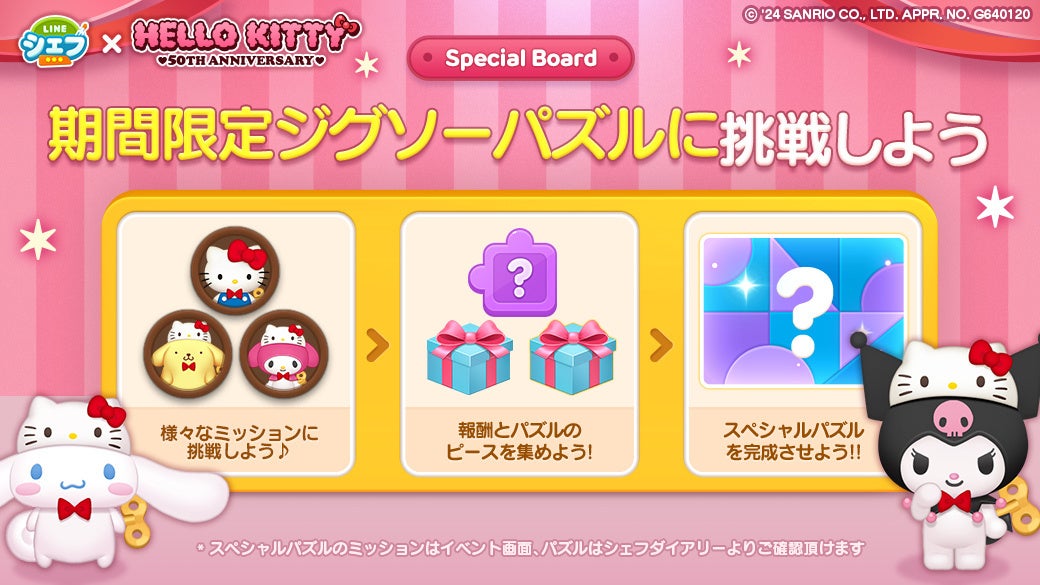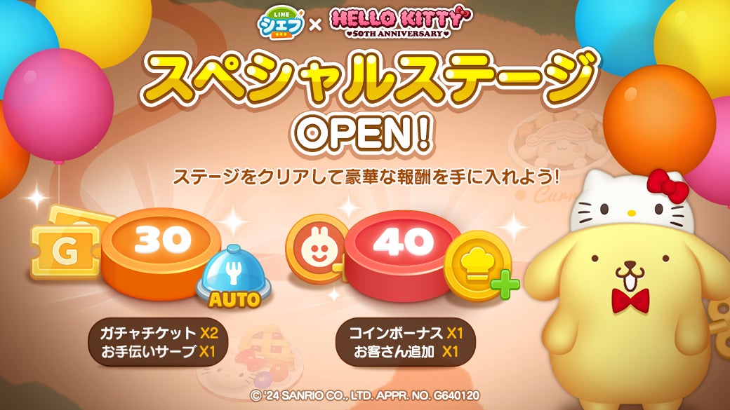 期間中、「LINE シェフ」に『サンリオキャラクターズ』からゲームをサポートしてくれるバディとして「ドレスアップ・ハローキティ」、「パーティ・ポムポムプリン」、「パーティ・マイメロディ」、「パーティ・クロミ」、「パーティ・シナモロール」がSグレードで登場するほか、コラボ仕様のレストランステージも登場します。