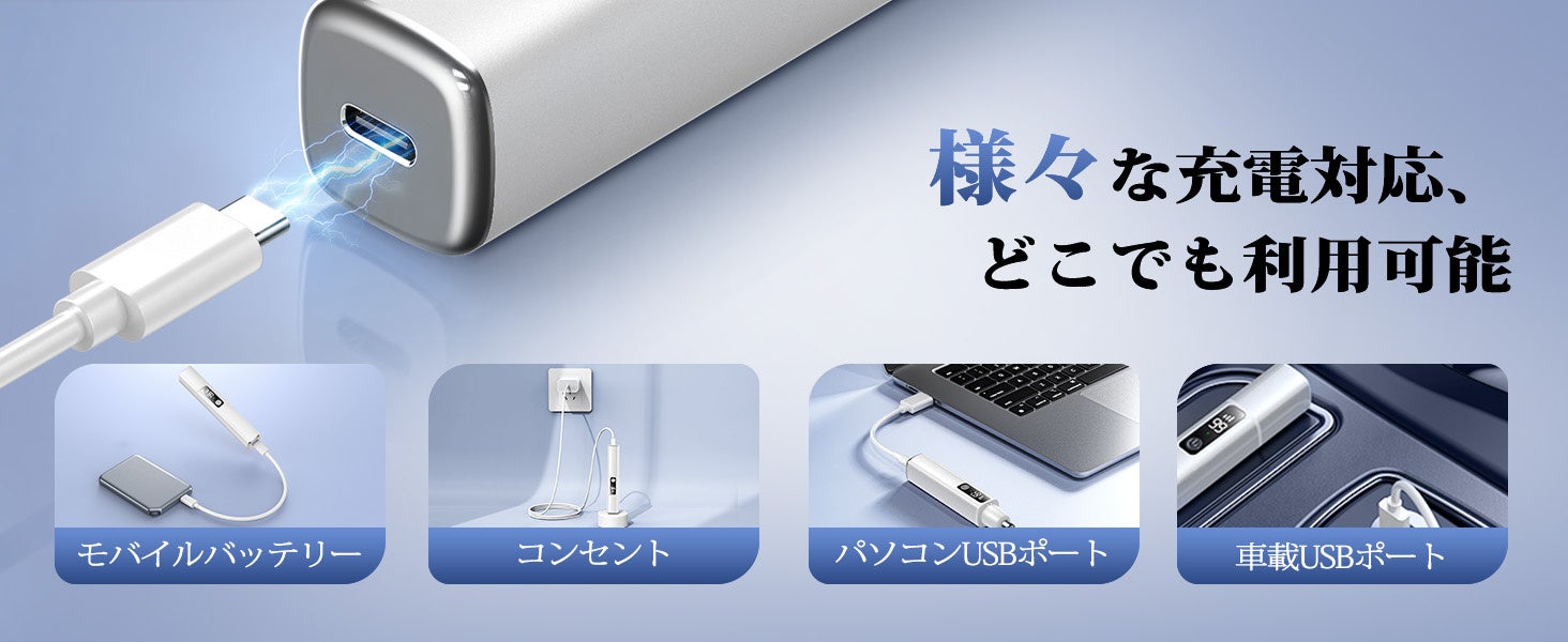 USB充電式のため、パソコンやモバイルバッテリー、車載USBなどから手軽に充電が可能。