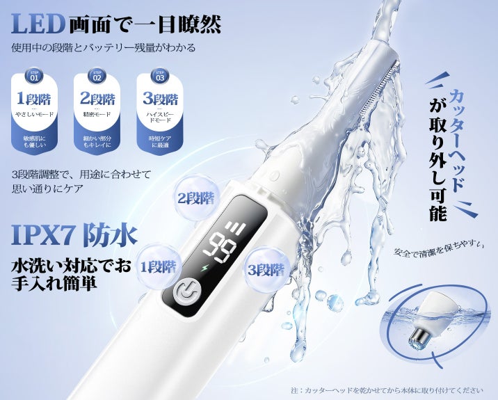 IPX7相当の防水設計により、毛くずや皮脂汚れが溜まりにくく、清潔な状態を保ちやすい構造です。替え刃式ヘッドのため、部位ごとに取り外して洗える点も特長です。