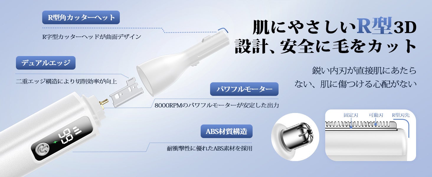 高精度ステンレス刃とR型鈍角刃先を採用し、刃が直接肌に触れにくい構造を実現。カミソリ負けや赤みを抑え、敏感肌の方でも使いやすい設計です。